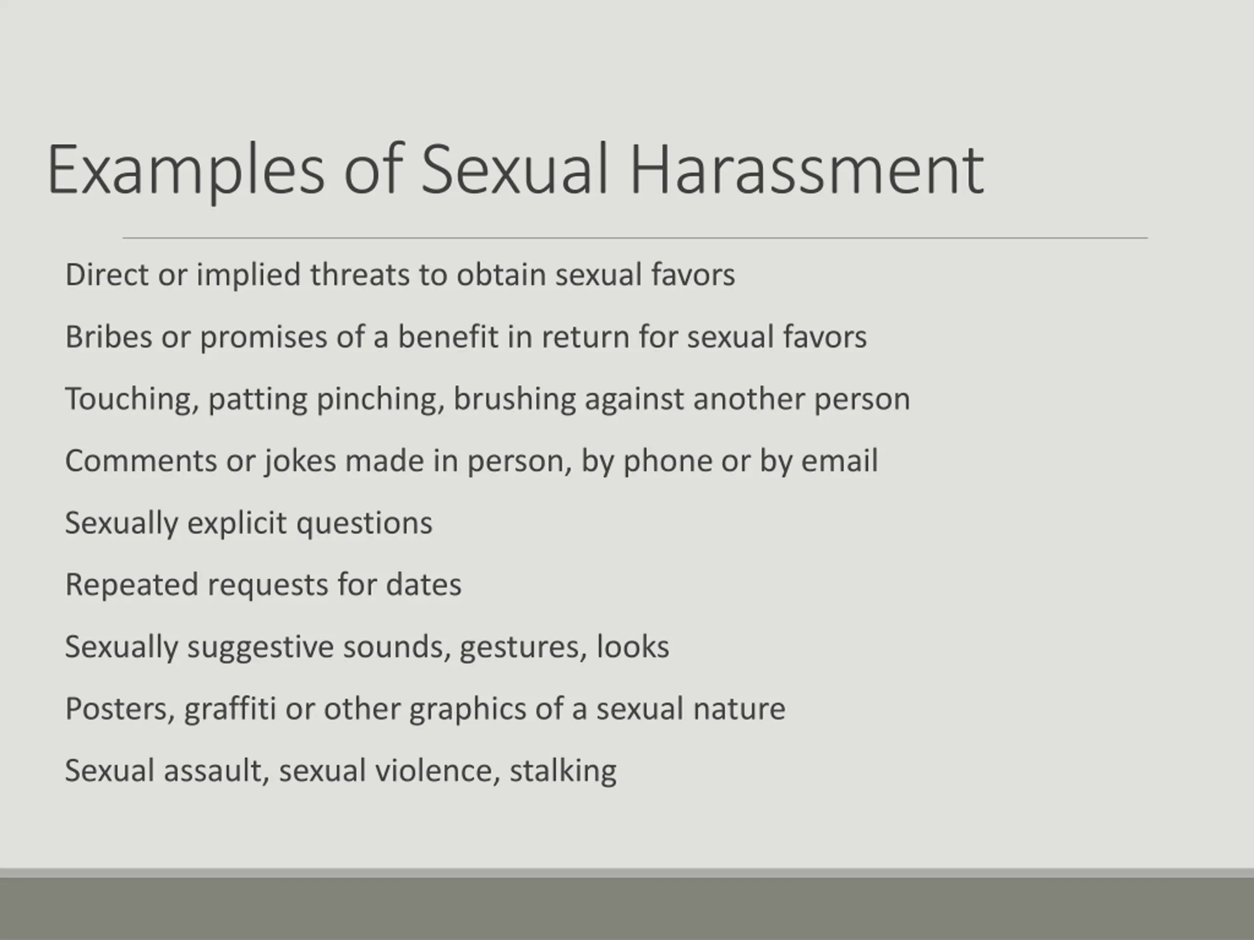 Examples of Sexual Harassment Direct or implied threats to obtain sexual favors Bribes or promises of a benefit in return for sexual favors Touching, patting pinching, brushing against another person Comments or jokes made in person, by phone or by email Sexually explicit questions Repeated requests for dates Sexually suggestive sounds, gestures, looks Posters, graffiti or other graphics of a sexual nature Sexual assault, sexual violence, stalking