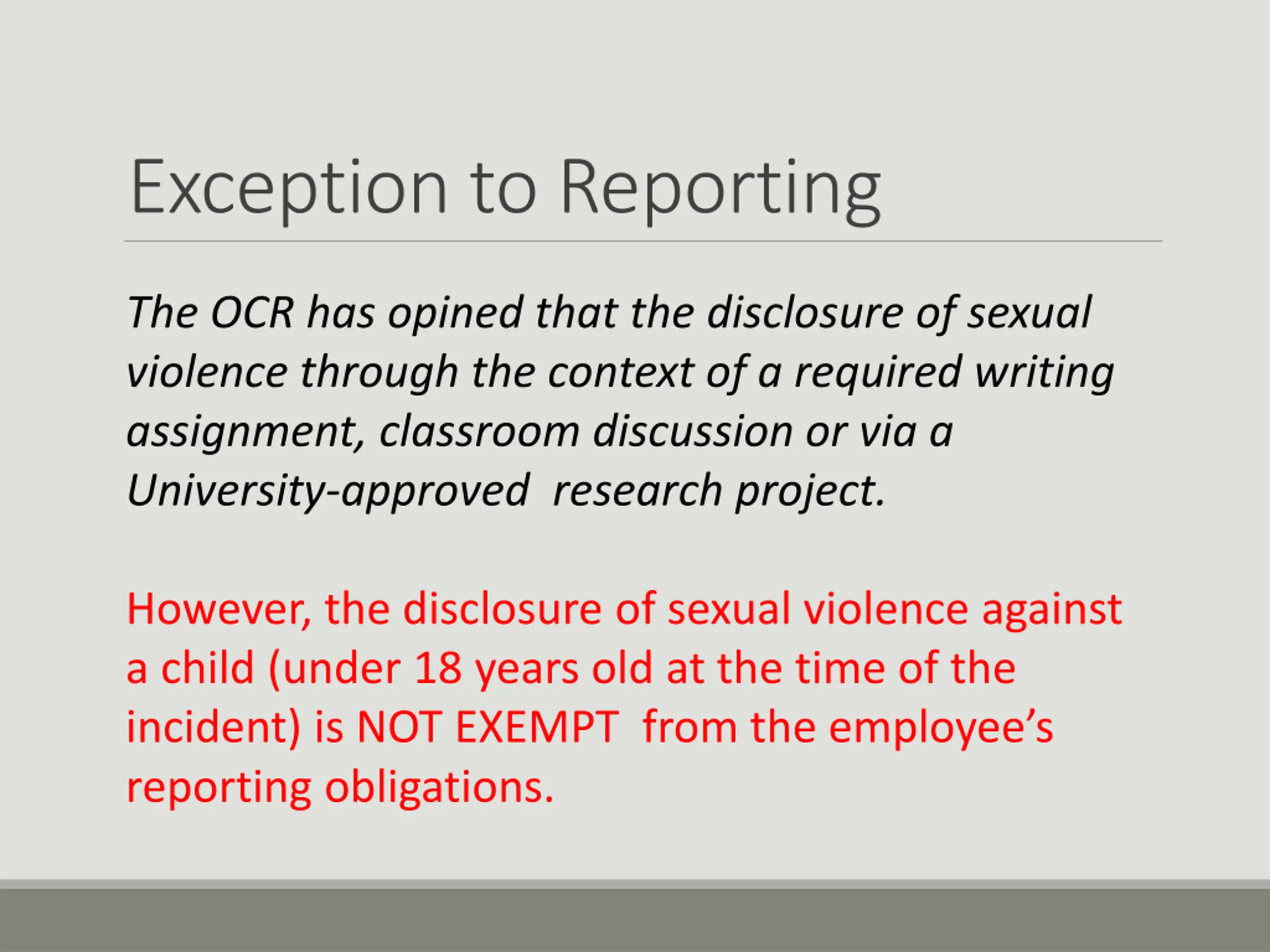 Exception to Reporting The OCR has opined that the disclosure of sexual violence through the context of a required writing assignment, classroom discussion or via a University-approved research project. However, the disclosure of sexual violence against a child (under 18 years old at the time of the incident) is NOT EXEMPT from the employee s reporting obligations.