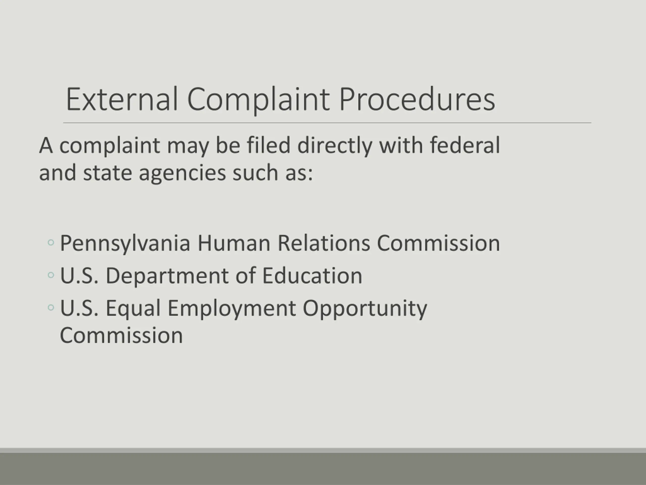 External Complaint Procedures A complaint may be filed directly with federal and state agencies such as: Pennsylvania Human Relations Commission U.S. Department of Education U.S. Equal Employment Opportunity Commission