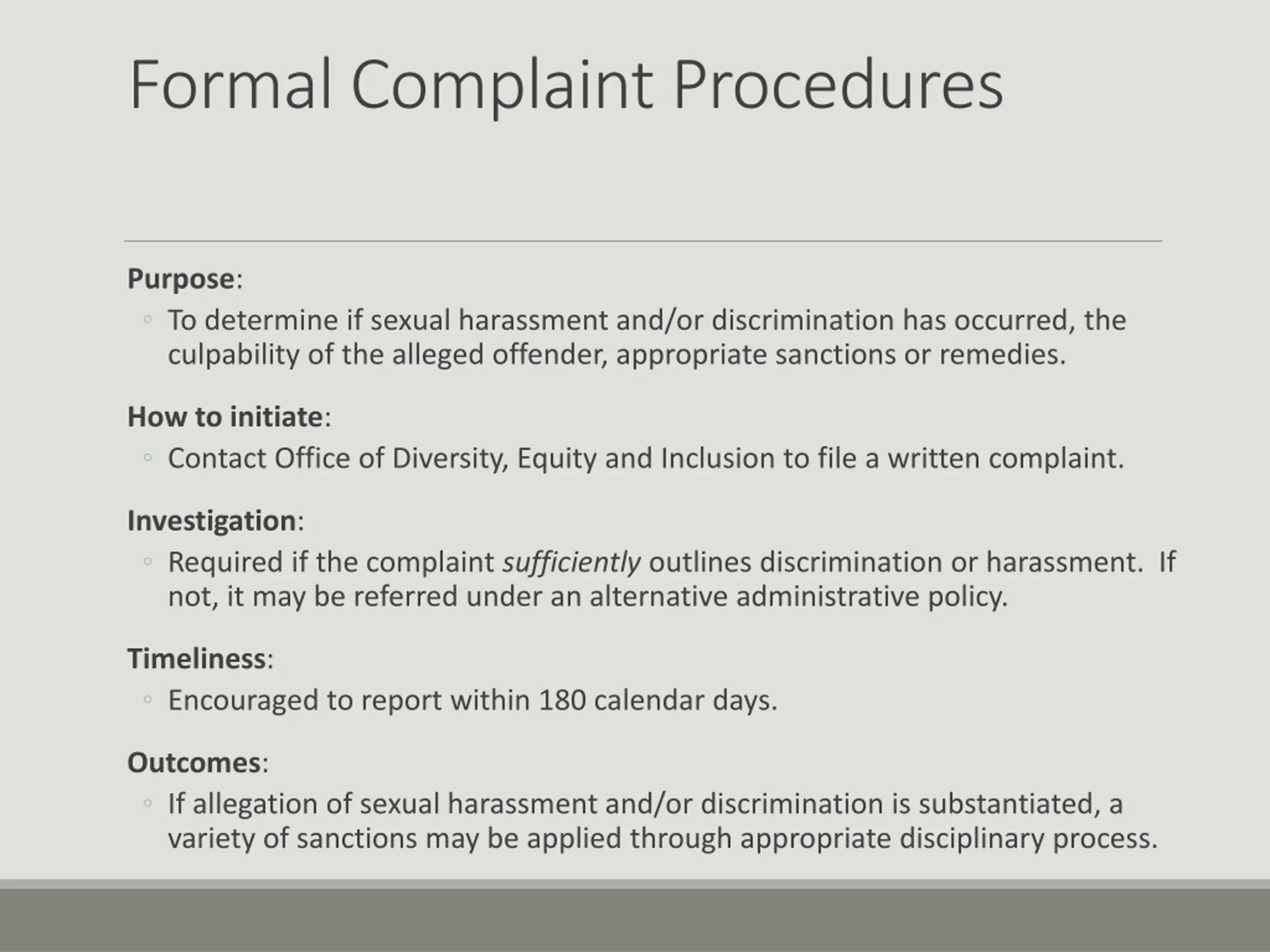 Formal Complaint Procedures Purpose: To determine if sexual harassment and/or discrimination has occurred, the culpability of the alleged offender, appropriate sanctions or remedies. How to initiate: Contact Office of Diversity, Equity and Inclusion to file a written complaint. Investigation: Required if the complaint sufficiently outlines discrimination or harassment. If not, it may be referred under an alternative administrative policy. Timeliness: Encouraged to report within 180 calendar days. Outcomes: If allegation of sexual harassment and/or discrimination is substantiated, a variety of sanctions may be applied through appropriate disciplinary process.
