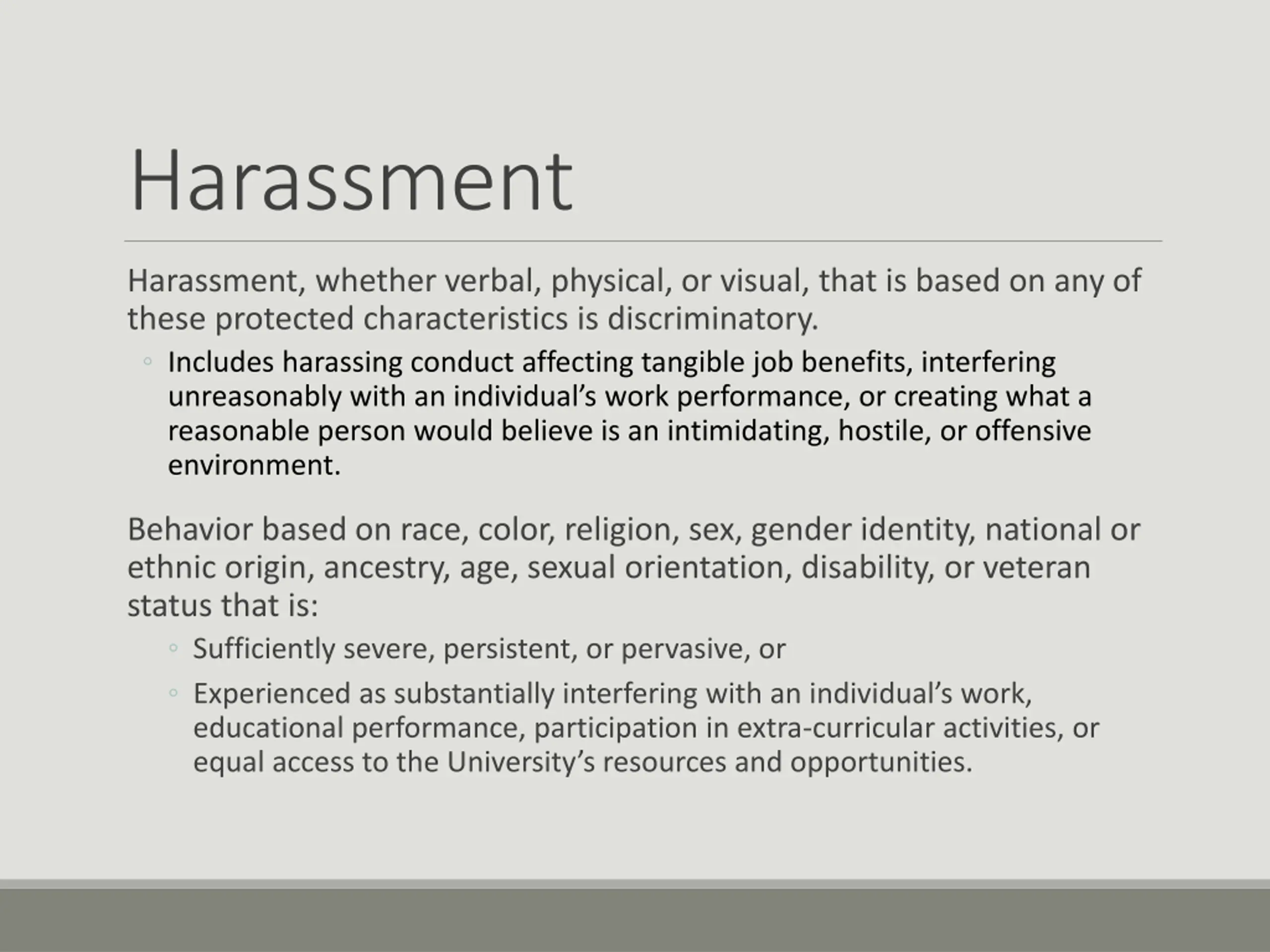Harassment Harassment, whether verbal, physical, or visual, that is based on any of these protected characteristics is discriminatory. Includes harassing conduct affecting tangible job benefits, interfering unreasonably with an individual s work performance, or creating what a reasonable person would believe is an intimidating, hostile, or offensive environment. Behavior based on race, color, religion, sex, gender identity, national or ethnic origin, ancestry, age, sexual orientation, disability, or veteran status that is: Sufficiently severe, persistent, or pervasive, or Experienced as substantially interfering with an individual s work, educational performance, participation in extra-curricular activities, or equal access to the University s resources and opportunities.