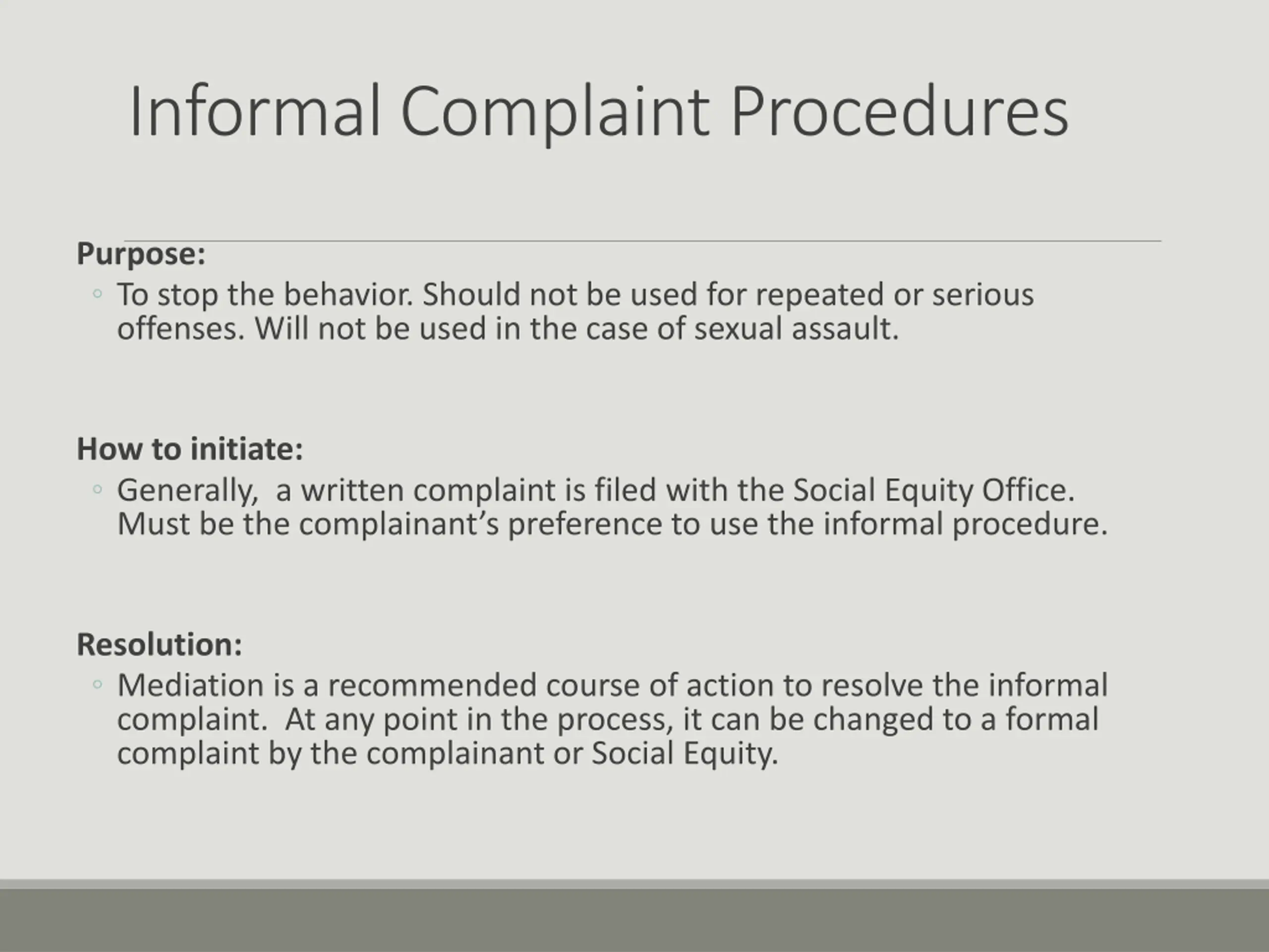 Informal Complaint Procedures Purpose: To stop the behavior. Should not be used for repeated or serious offenses. Will not be used in the case of sexual assault. How to initiate: Generally, a written complaint is filed with the Social Equity Office. Must be the complainant s preference to use the informal procedure. Resolution: Mediation is a recommended course of action to resolve the informal complaint. At any point in the process, it can be changed to a formal complaint by the complainant or Social Equity.