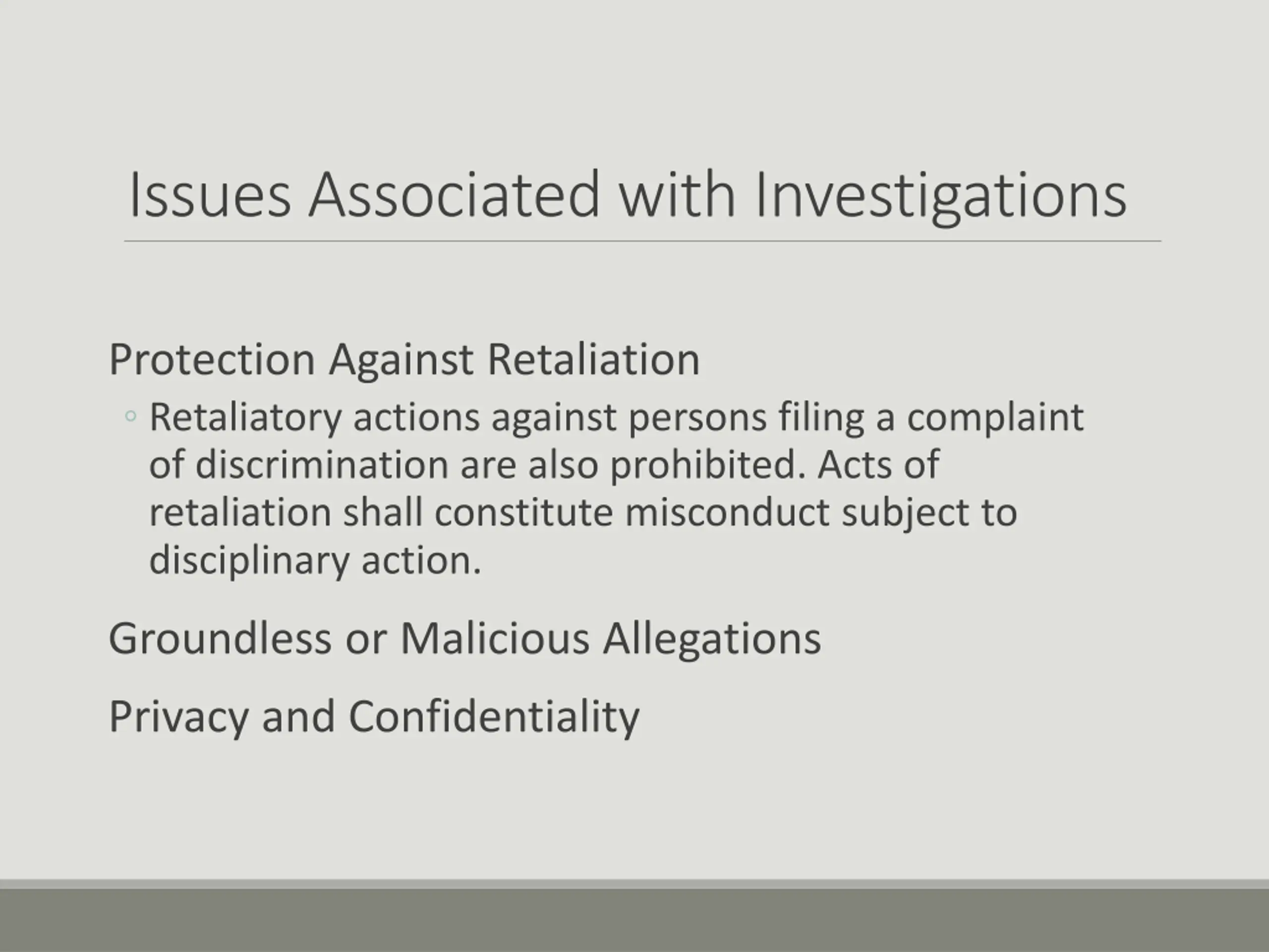 Issues Associated with Investigations Protection Against Retaliation Retaliatory actions against persons filing a complaint of discrimination are also prohibited. Acts of retaliation shall constitute misconduct subject to disciplinary action. Groundless or Malicious Allegations Privacy and Confidentiality