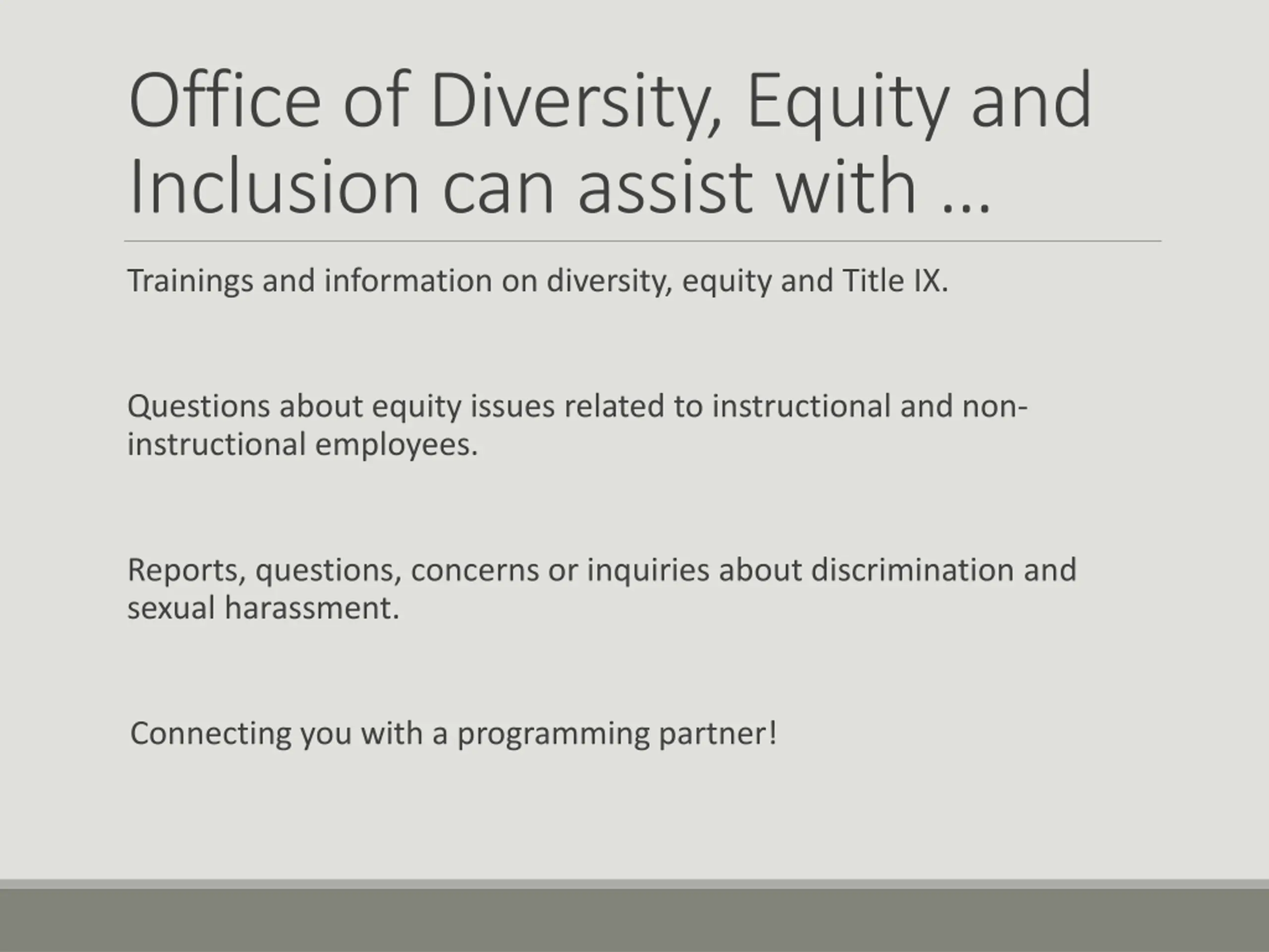 Office of Diversity, Equity and Inclusion can assist with Trainings and information on diversity, equity and Title IX. Questions about equity issues related to instructional and non- instructional employees. Reports, questions, concerns or inquiries about discrimination and sexual harassment. Connecting you with a programming partner!