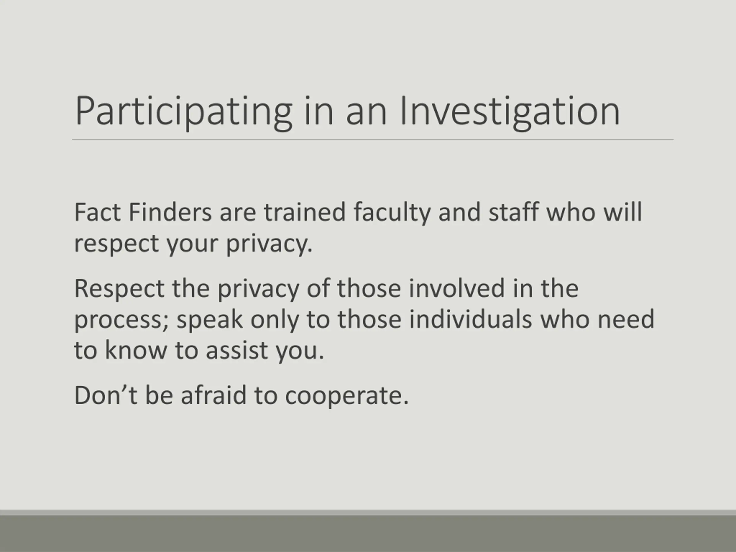 Participating in an Investigation Fact Finders are trained faculty and staff who will respect your privacy. Respect the privacy of those involved in the process; speak only to those individuals who need to know to assist you. Don t be afraid to cooperate.