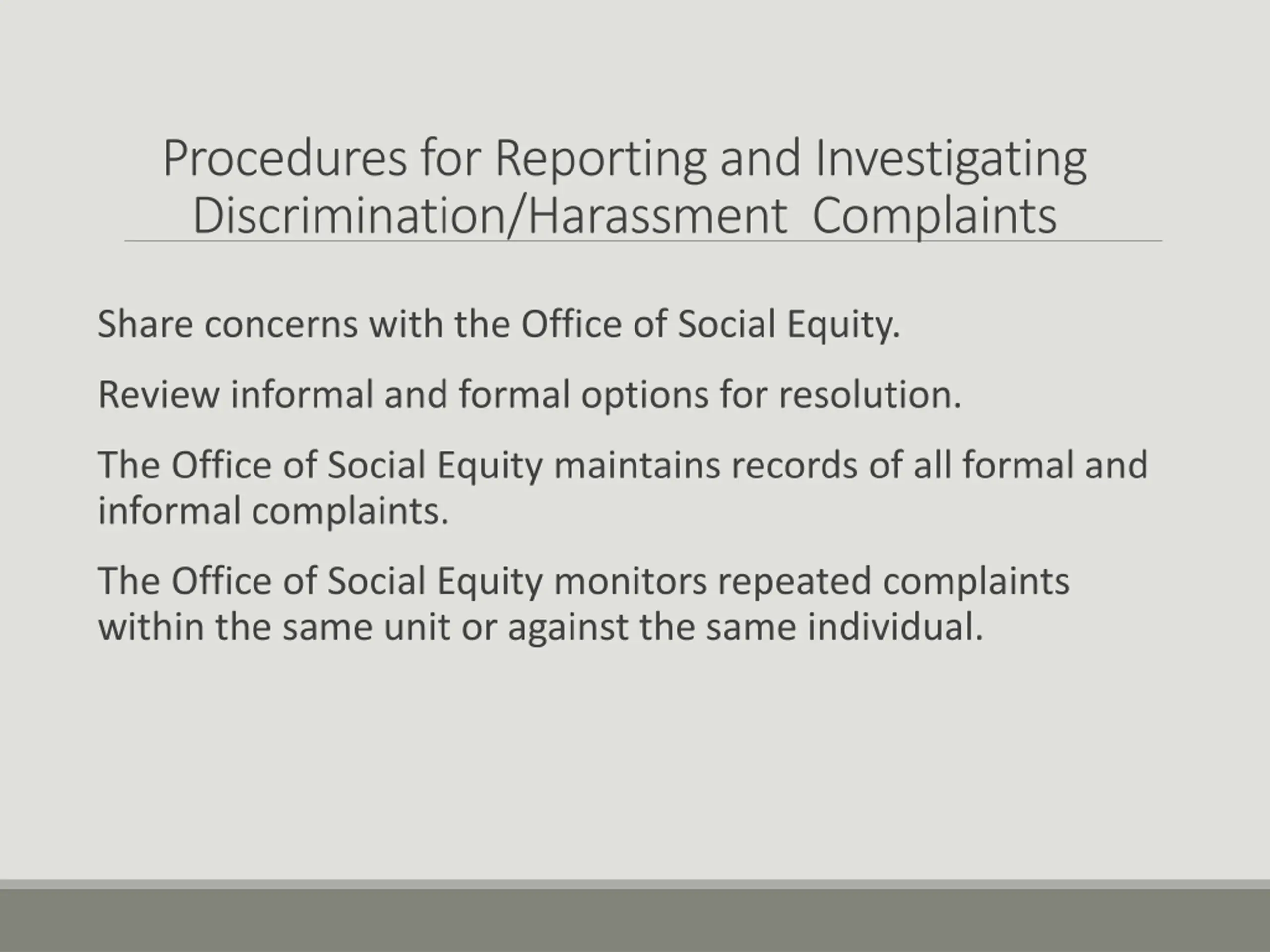 Procedures for Reporting and Investigating Discrimination/Harassment Complaints Share concerns with the Office of Social Equity. Review informal and formal options for resolution. The Office of Social Equity maintains records of all formal and informal complaints. The Office of Social Equity monitors repeated complaints within the same unit or against the same individual.