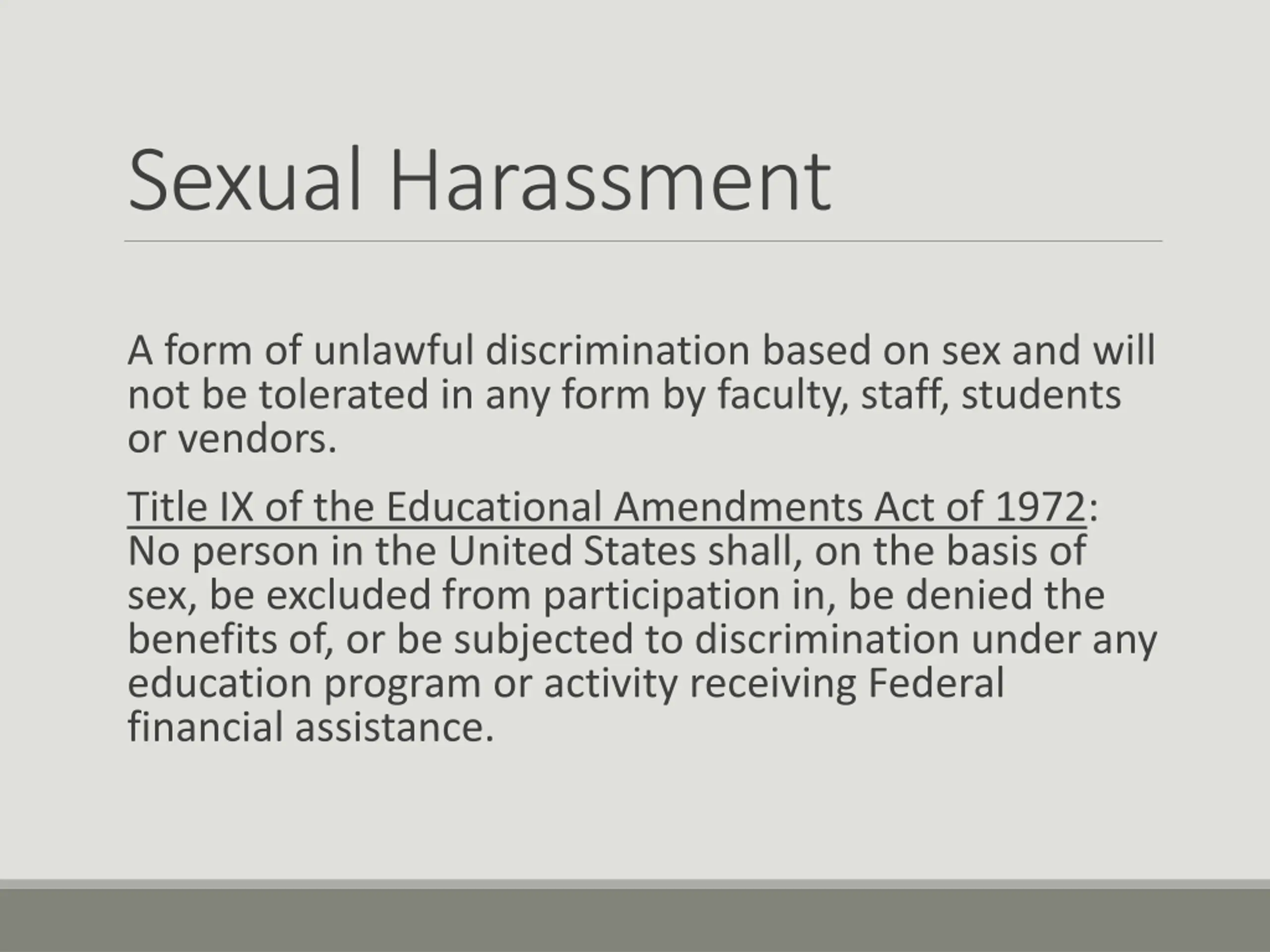 Sexual Harassment A form of unlawful discrimination based on sex and will not be tolerated in any form by faculty, staff, students or vendors. Title IX of the Educational Amendments Act of 1972: No person in the United States shall, on the basis of sex, be excluded from participation in, be denied the benefits of, or be subjected to discrimination under any education program or activity receiving Federal financial assistance.