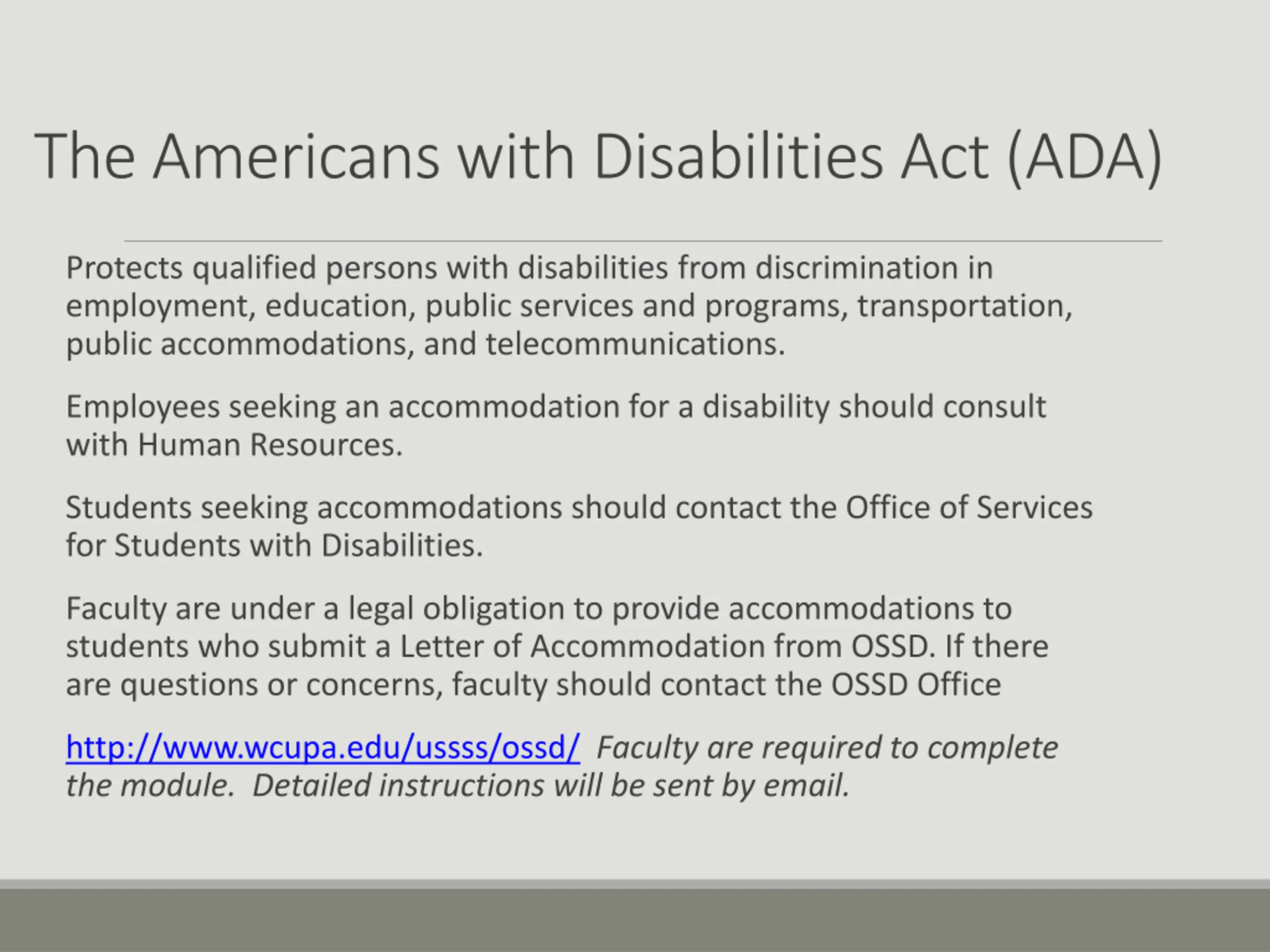 The Americans with Disabilities Act (ADA) Protects qualified persons with disabilities from discrimination in employment, education, public services and programs, transportation, public accommodations, and telecommunications. Employees seeking an accommodation for a disability should consult with Human Resources. Students seeking accommodations should contact the Office of Services for Students with Disabilities. Faculty are under a legal obligation to provide accommodations to students who submit a Letter of Accommodation from OSSD. If there are questions or concerns, faculty should contact the OSSD Office http://www.wcupa.edu/ussss/ossd/ Faculty are required to complete the module. Detailed instructions will be sent by email.