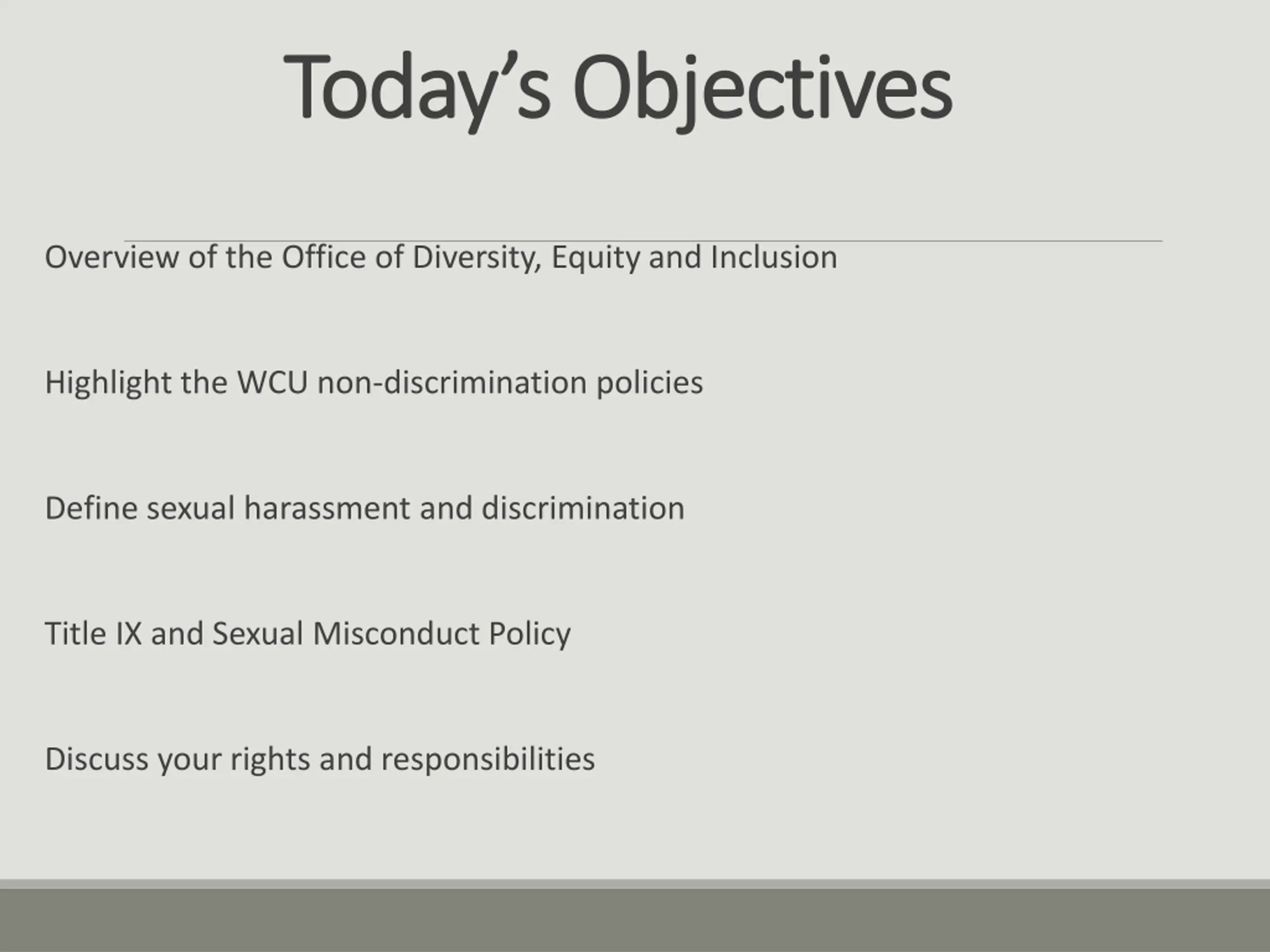 Todays Objectives Today s Objectives Overview of the Office of Diversity, Equity and Inclusion Highlight the WCU non-discrimination policies Define sexual harassment and discrimination Title IX and Sexual Misconduct Policy Discuss your rights and responsibilities