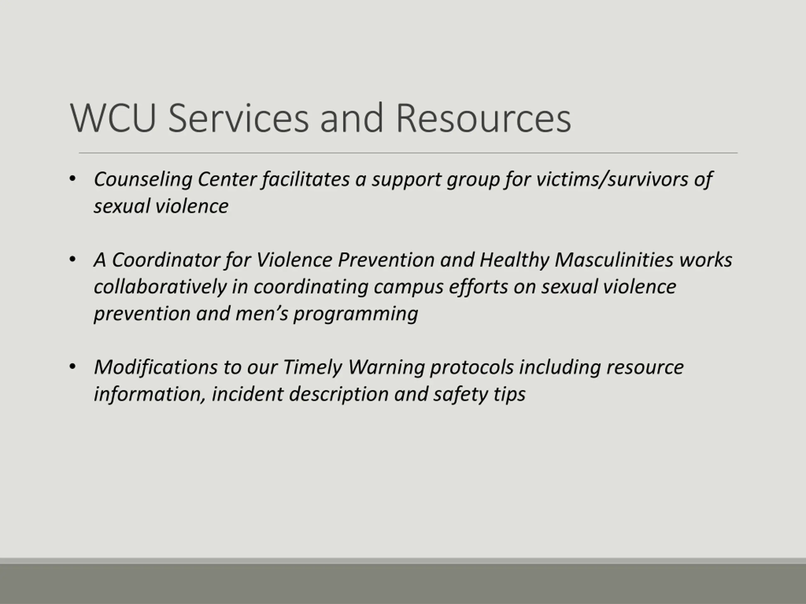 WCU Services and Resources Counseling Center facilitates a support group for victims/survivors of sexual violence A Coordinator for Violence Prevention and Healthy Masculinities works collaboratively in coordinating campus efforts on sexual violence prevention and men s programming Modifications to our Timely Warning protocols including resource information, incident description and safety tips