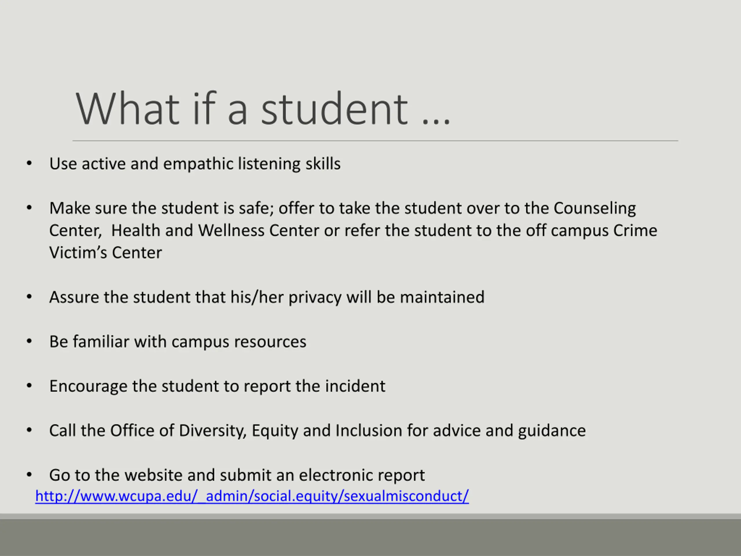 What if a student Use active and empathic listening skills Make sure the student is safe; offer to take the student over to the Counseling Center, Health and Wellness Center or refer the student to the off campus Crime Victim s Center Assure the student that his/her privacy will be maintained Be familiar with campus resources Encourage the student to report the incident Call the Office of Diversity, Equity and Inclusion for advice and guidance Go to the website and submit an electronic report http://www.wcupa.edu/_admin/social.equity/sexualmisconduct/