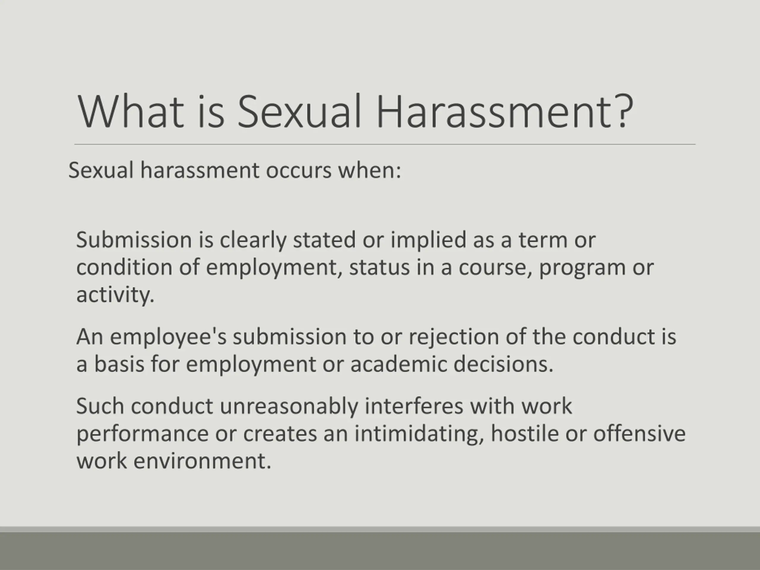 What is Sexual Harassment? Sexual harassment occurs when: Submission is clearly stated or implied as a term or condition of employment, status in a course, program or activity. An employee's submission to or rejection of the conduct is a basis for employment or academic decisions. Such conduct unreasonably interferes with work performance or creates an intimidating, hostile or offensive work environment.
