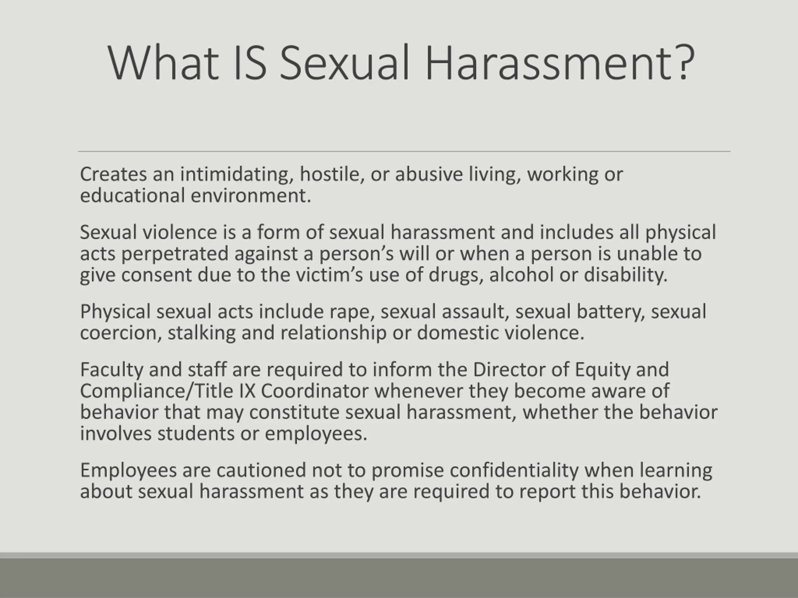 What IS Sexual Harassment? Creates an intimidating, hostile, or abusive living, working or educational environment. Sexual violence is a form of sexual harassment and includes all physical acts perpetrated against a person s will or when a person is unable to give consent due to the victim s use of drugs, alcohol or disability. Physical sexual acts include rape, sexual assault, sexual battery, sexual coercion, stalking and relationship or domestic violence. Faculty and staff are required to inform the Director of Equity and Compliance/Title IX Coordinator whenever they become aware of behavior that may constitute sexual harassment, whether the behavior involves students or employees. Employees are cautioned not to promise confidentiality when learning about sexual harassment as they are required to report this behavior.