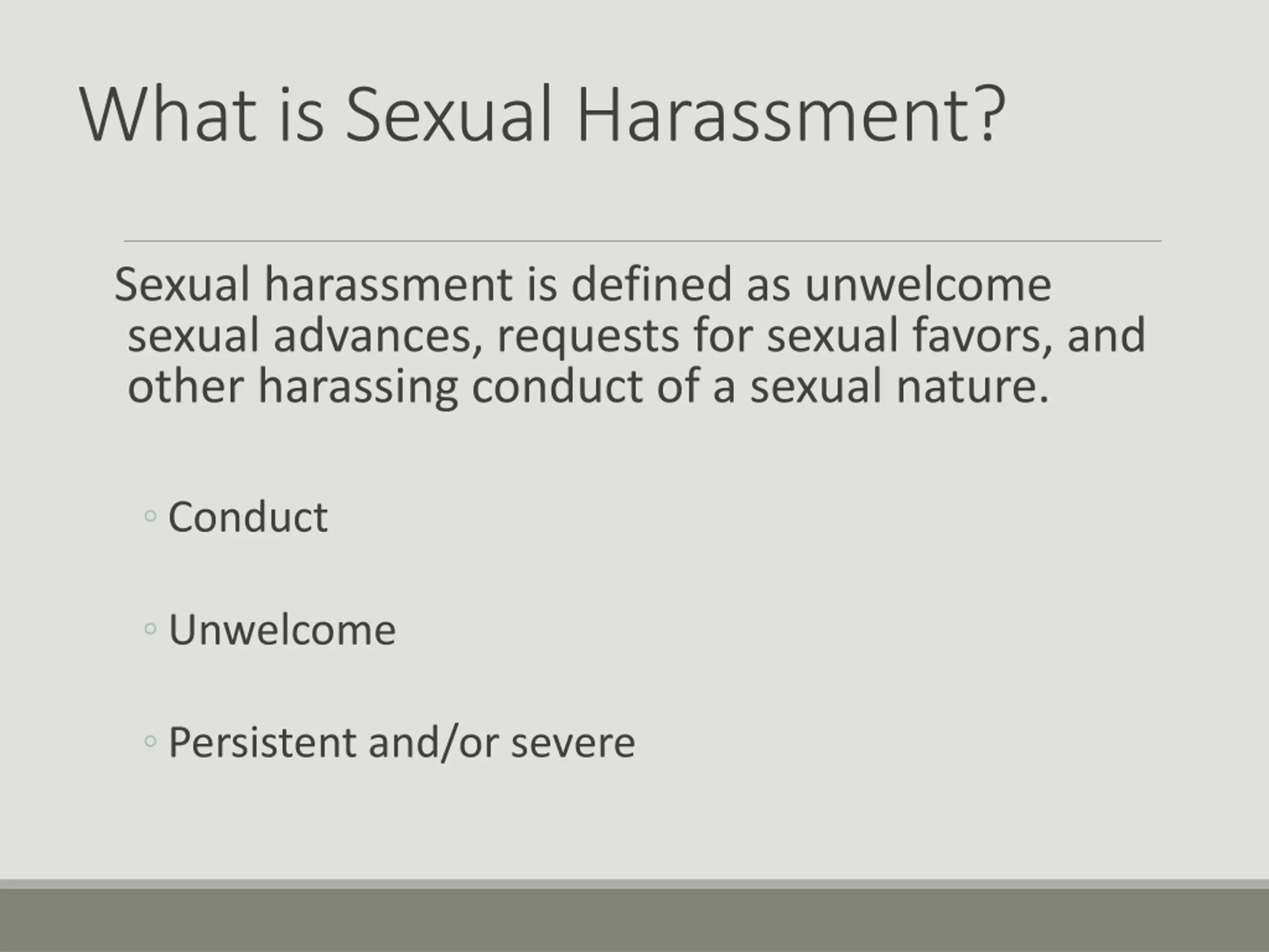 What is Sexual Harassment? Sexual harassment is defined as unwelcome sexual advances, requests for sexual favors, and other harassing conduct of a sexual nature. Conduct Unwelcome Persistent and/or severe