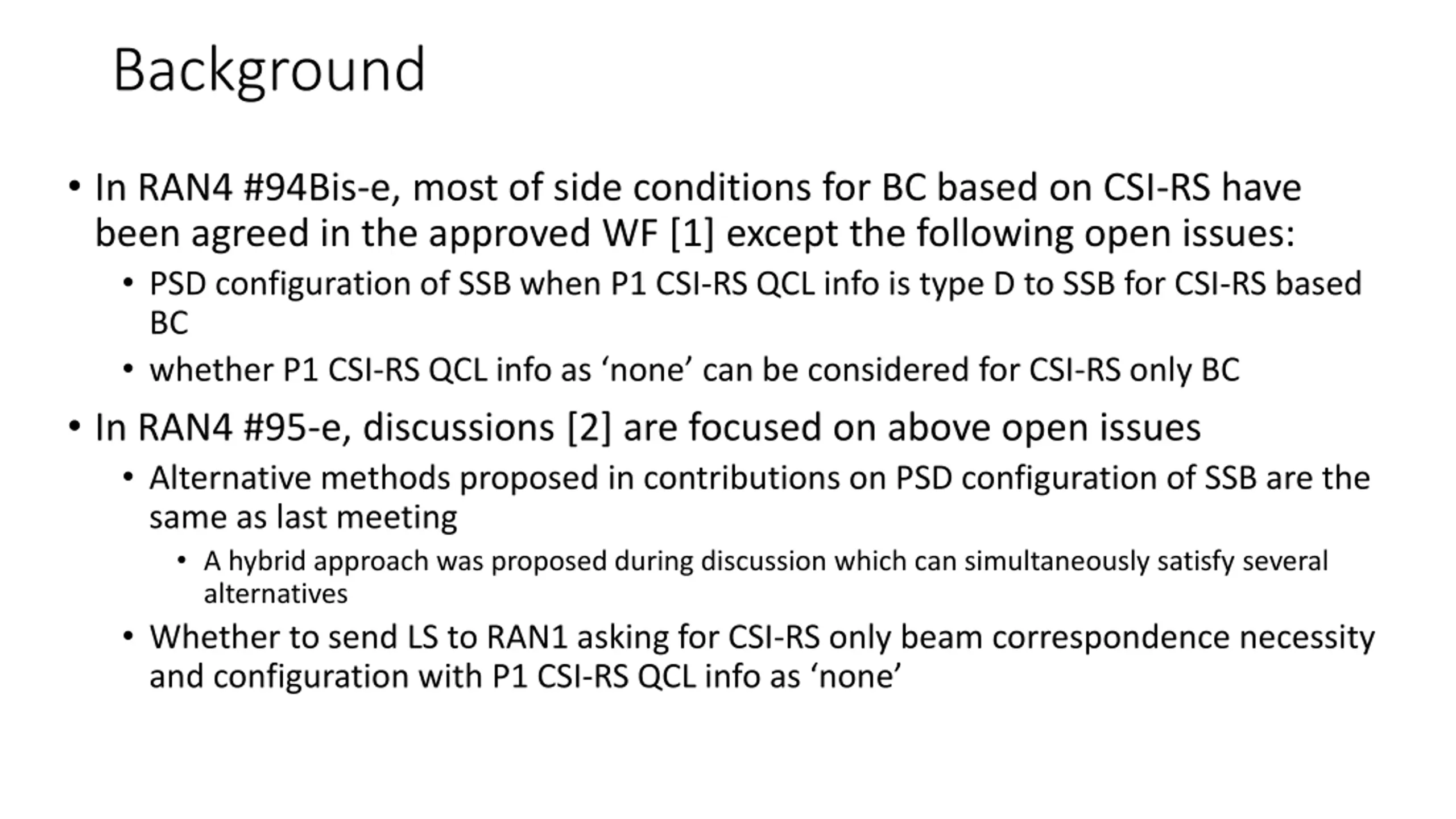 Background In RAN4 #94Bis-e, most of side conditions for BC based on CSI-RS have been agreed in the approved WF [1] except the following open issues: PSD configuration of SSB when P1 CSI-RS QCL info is type D to SSB for CSI-RS based BC whether P1 CSI-RS QCL info as none can be considered for CSI-RS only BC In RAN4 #95-e, discussions [2] are focused on above open issues Alternative methods proposed in contributions on PSD configuration of SSB are the same as last meeting A hybrid approach was proposed during discussion which can simultaneously satisfy several alternatives Whether to send LS to RAN1 asking for CSI-RS only beam correspondence necessity and configuration with P1 CSI-RS QCL info as none