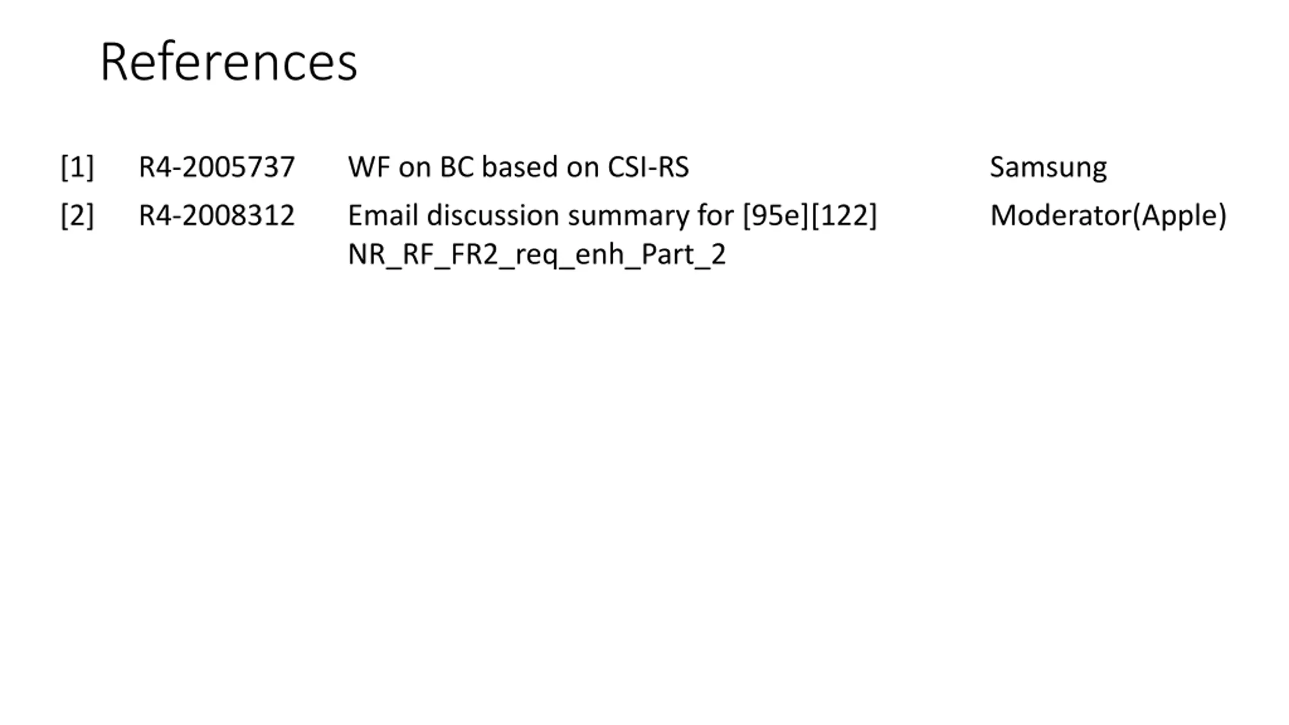 References [1] R4-2005737 WF on BC based on CSI-RS Samsung [2] R4-2008312 Email discussion summary for [95e][122] NR_RF_FR2_req_enh_Part_2 Moderator(Apple)