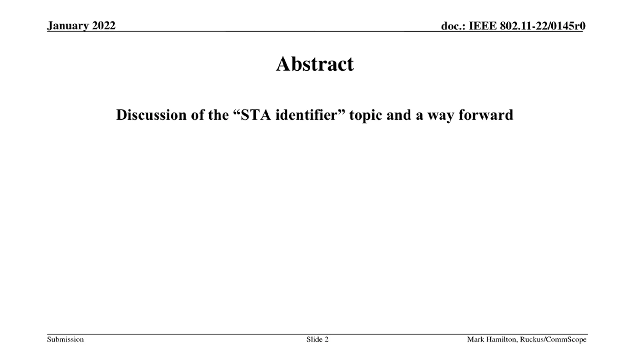 January 2022 doc.: IEEE 802.11-22/0145r0 Abstract Discussion of the STA identifier topic and a way forward Submission Slide 2 Mark Hamilton, Ruckus/CommScope
