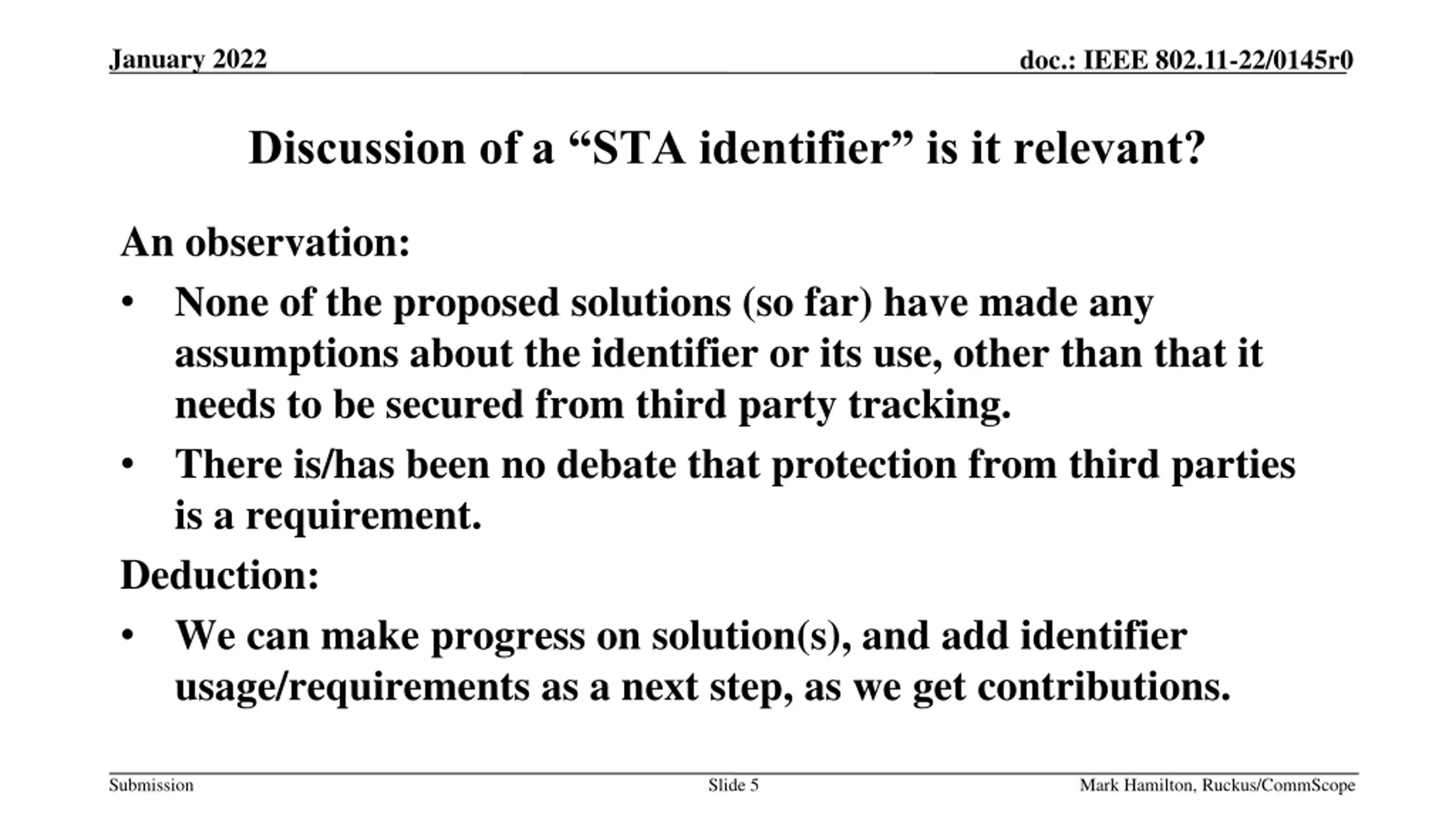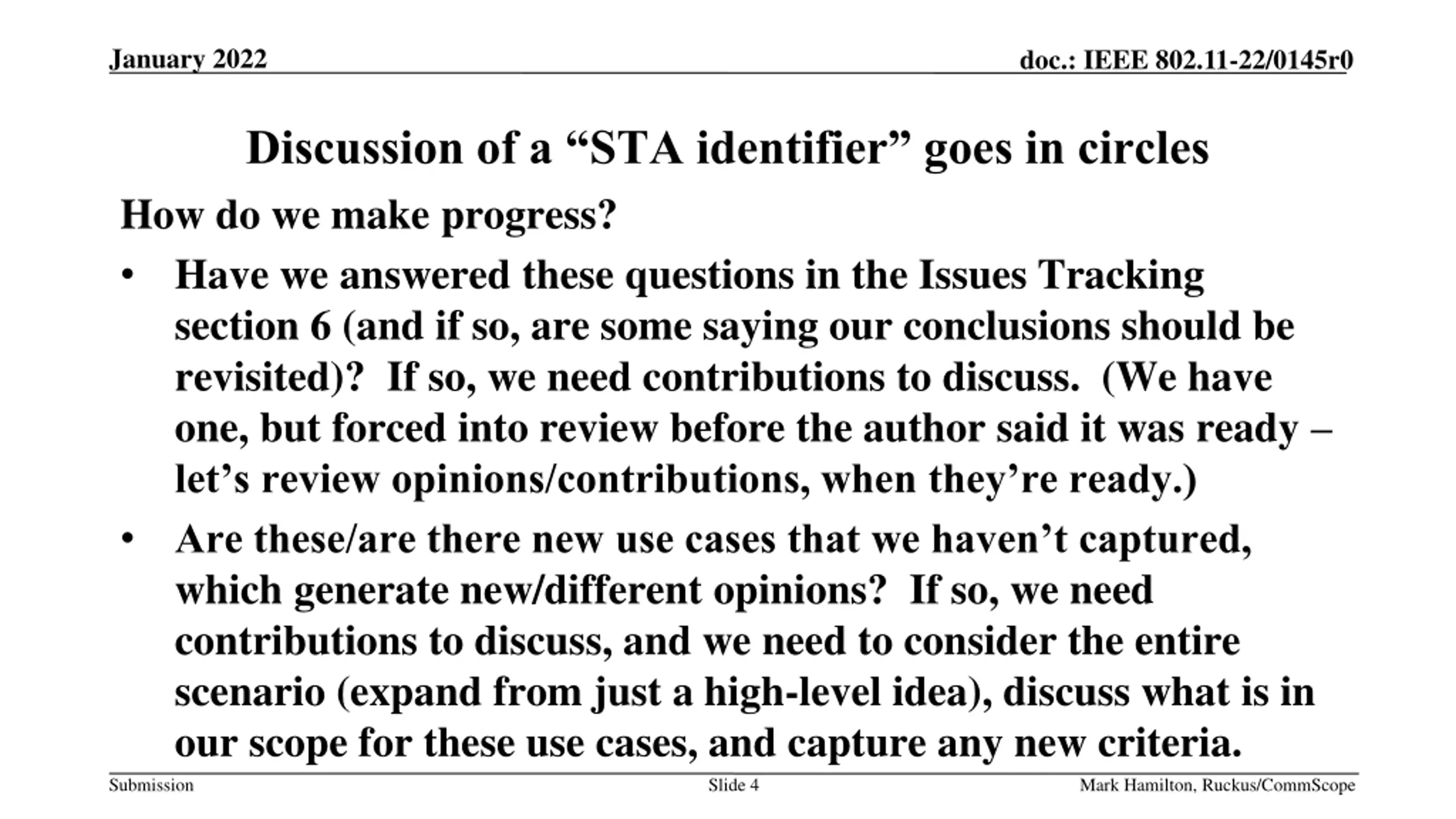 January 2022 doc.: IEEE 802.11-22/0145r0 Discussion of a STA identifier goes in circles How do we make progress? Have we answered these questions in the Issues Tracking section 6 (and if so, are some saying our conclusions should be revisited)? If so, we need contributions to discuss. (We have one, but forced into review before the author said it was ready let s review opinions/contributions, when they re ready.) Are these/are there new use cases that we haven t captured, which generate new/different opinions? If so, we need contributions to discuss, and we need to consider the entire scenario (expand from just a high-level idea), discuss what is in our scope for these use cases, and capture any new criteria. Slide 4 Submission Mark Hamilton, Ruckus/CommScope