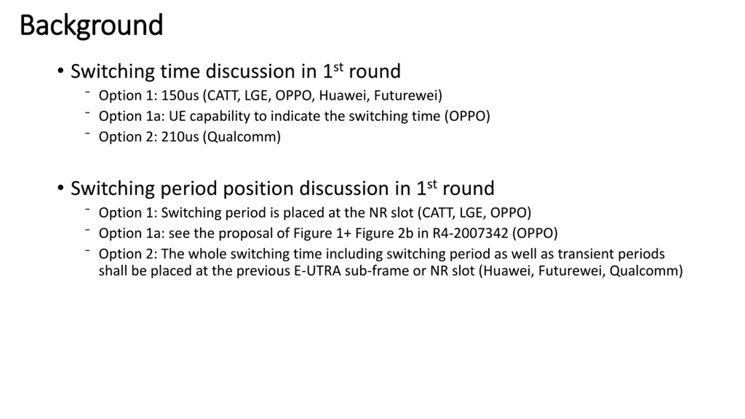 Background Background Switching time discussion in 1stround Option 1: 150us (CATT, LGE, OPPO, Huawei, Futurewei) Option 1a: UE capability to indicate the switching time (OPPO) Option 2: 210us (Qualcomm) Switching period position discussion in 1stround Option 1: Switching period is placed at the NR slot (CATT, LGE, OPPO) Option 1a: see the proposal of Figure 1+ Figure 2b in R4-2007342 (OPPO) Option 2: The whole switching time including switching period as well as transient periods shall be placed at the previous E-UTRA sub-frame or NR slot (Huawei, Futurewei, Qualcomm)
