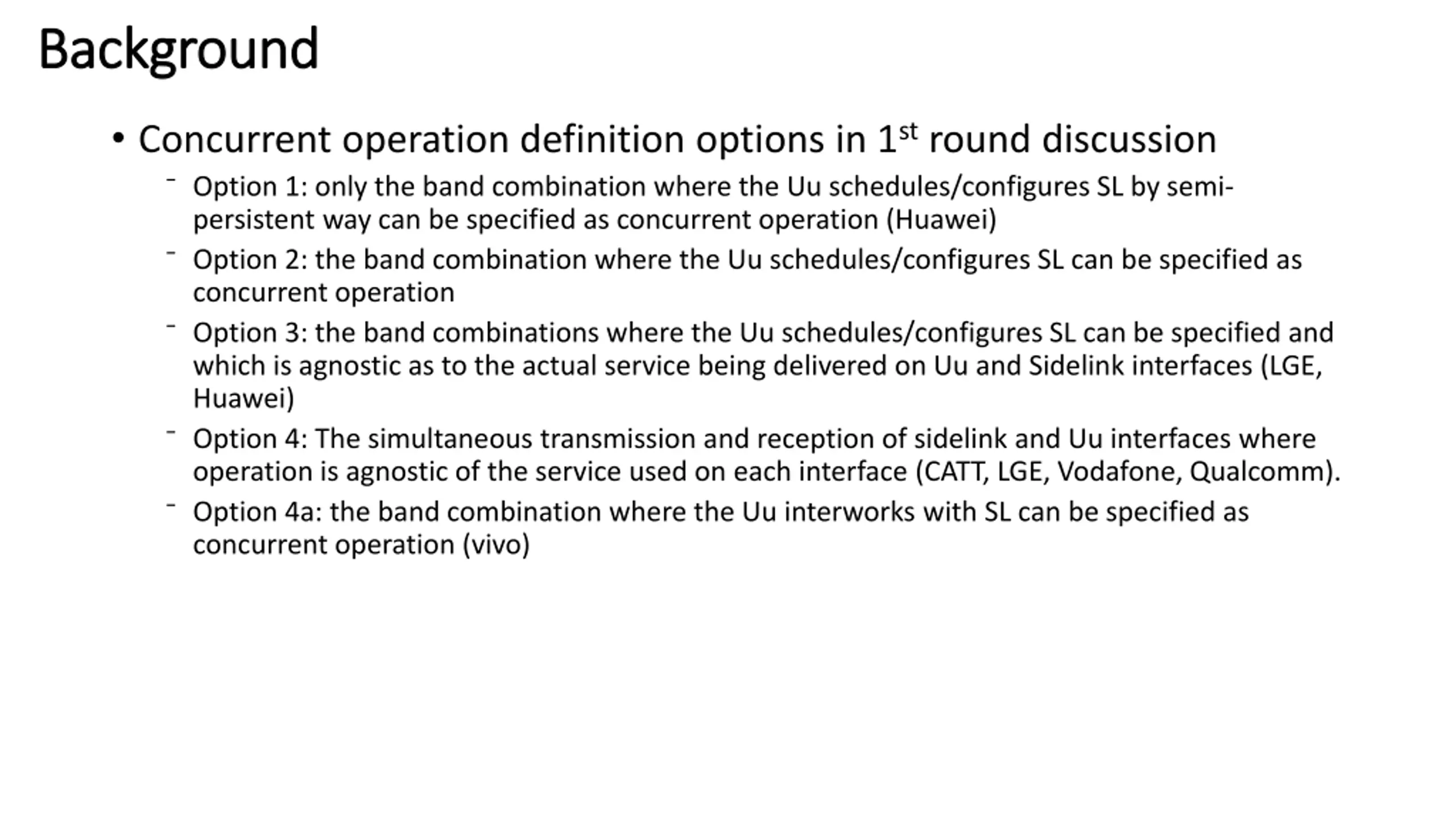 Background Background Concurrent operation definition options in 1stround discussion Option 1: only the band combination where the Uu schedules/configures SL by semi- persistent way can be specified as concurrent operation (Huawei) Option 2: the band combination where the Uu schedules/configures SL can be specified as concurrent operation Option 3: the band combinations where the Uu schedules/configures SL can be specified and which is agnostic as to the actual service being delivered on Uu and Sidelink interfaces (LGE, Huawei) Option 4: The simultaneous transmission and reception of sidelink and Uu interfaces where operation is agnostic of the service used on each interface (CATT, LGE, Vodafone, Qualcomm). Option 4a: the band combination where the Uu interworks with SL can be specified as concurrent operation (vivo)