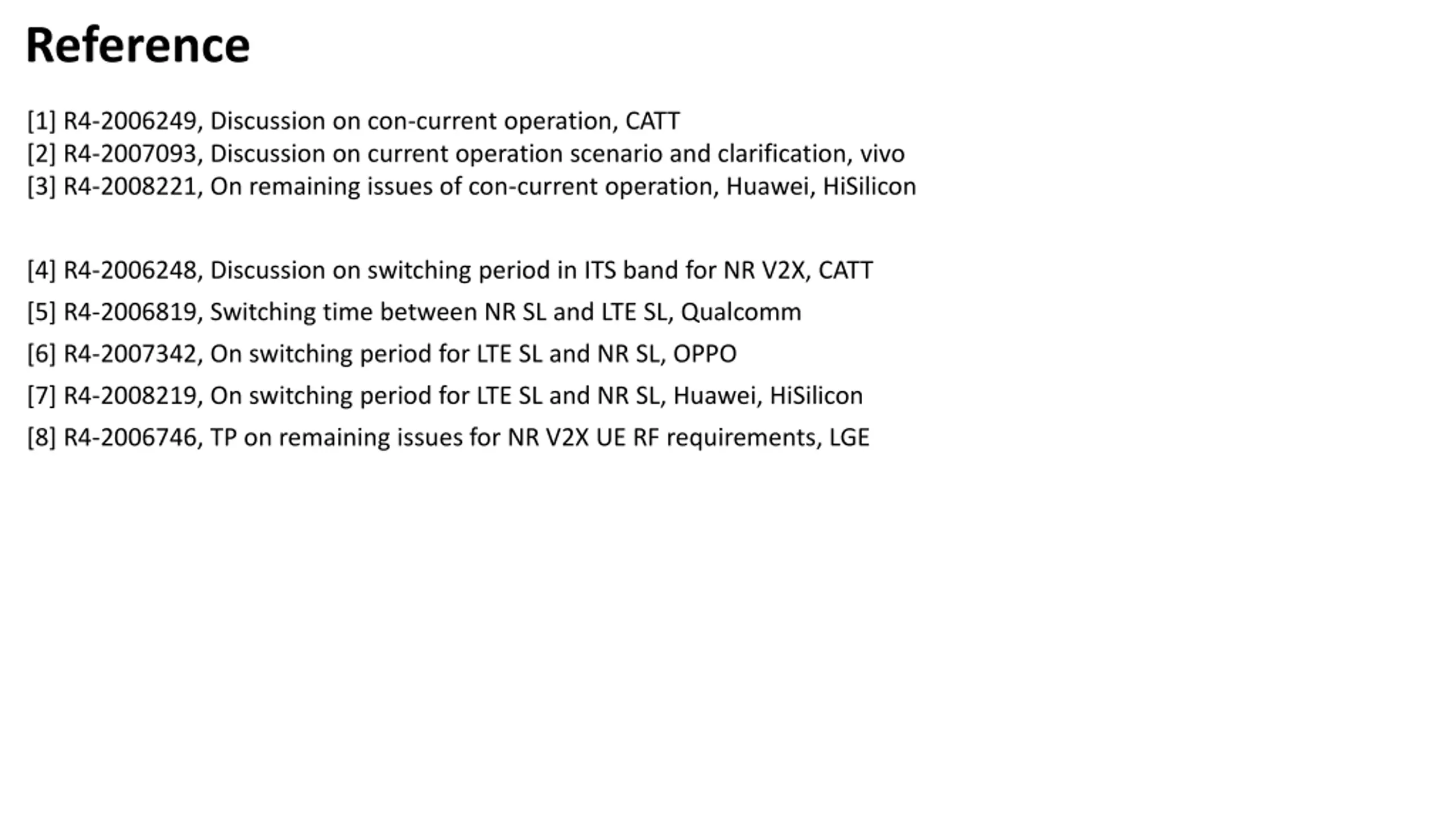 Reference [1] R4-2006249, Discussion on con-current operation, CATT [2] R4-2007093, Discussion on current operation scenario and clarification, vivo [3] R4-2008221, On remaining issues of con-current operation, Huawei, HiSilicon [4] R4-2006248, Discussion on switching period in ITS band for NR V2X, CATT [5] R4-2006819, Switching time between NR SL and LTE SL, Qualcomm [6] R4-2007342, On switching period for LTE SL and NR SL, OPPO [7] R4-2008219, On switching period for LTE SL and NR SL, Huawei, HiSilicon [8] R4-2006746, TP on remaining issues for NR V2X UE RF requirements, LGE