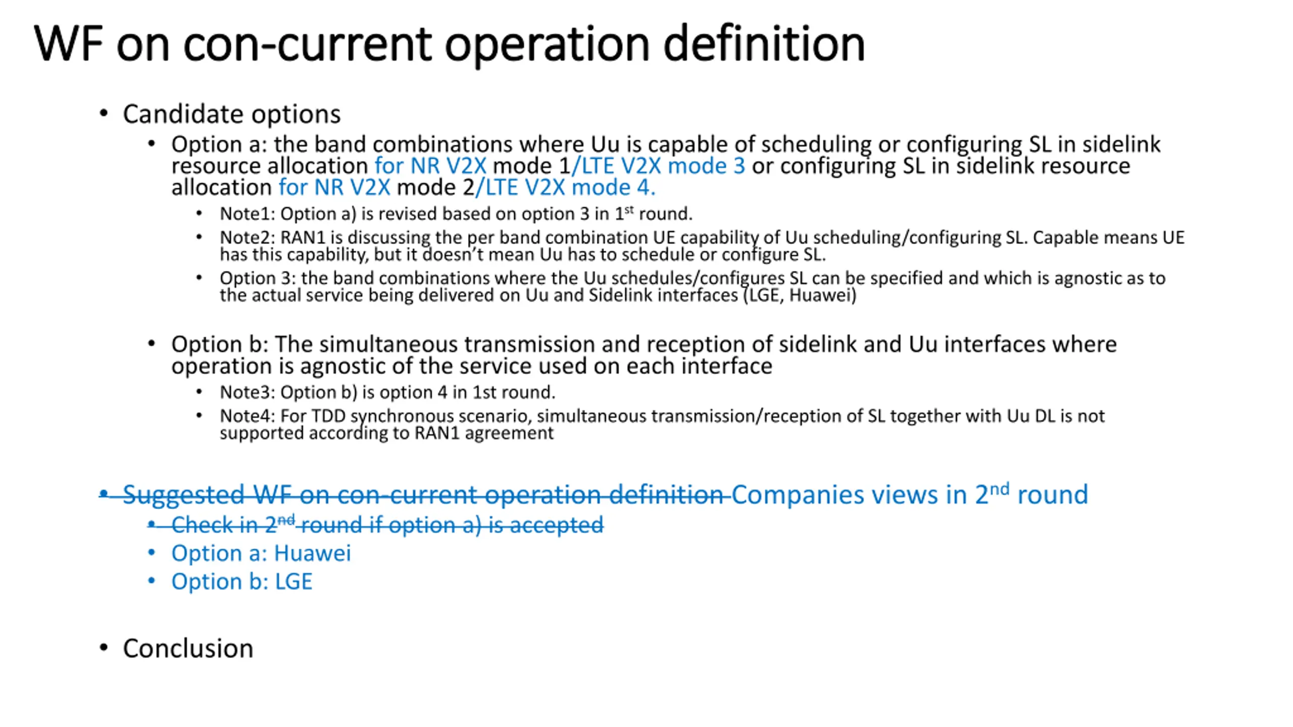 WF on con WF on con- -current operation definition current operation definition Candidate options Option a: the band combinations where Uu is capable of scheduling or configuring SL in sidelink resource allocation for NR V2X mode 1/LTE V2X mode 3 or configuring SL in sidelink resource allocation for NR V2X mode 2/LTE V2X mode 4. Note1: Option a) is revised based on option 3 in 1stround. Note2: RAN1 is discussing the per band combination UE capability of Uu scheduling/configuring SL. Capable means UE has this capability, but it doesn t mean Uu has to schedule or configure SL. Option 3: the band combinations where the Uu schedules/configures SL can be specified and which is agnostic as to the actual service being delivered on Uu and Sidelink interfaces (LGE, Huawei) Option b: The simultaneous transmission and reception of sidelink and Uu interfaces where operation is agnostic of the service used on each interface Note3: Option b) is option 4 in 1st round. Note4: For TDD synchronous scenario, simultaneous transmission/reception of SL together with Uu DL is not supported according to RAN1 agreement Suggested WF on con-current operation definition Companies views in 2ndround Check in 2ndround if option a) is accepted Option a: Huawei Option b: LGE Conclusion