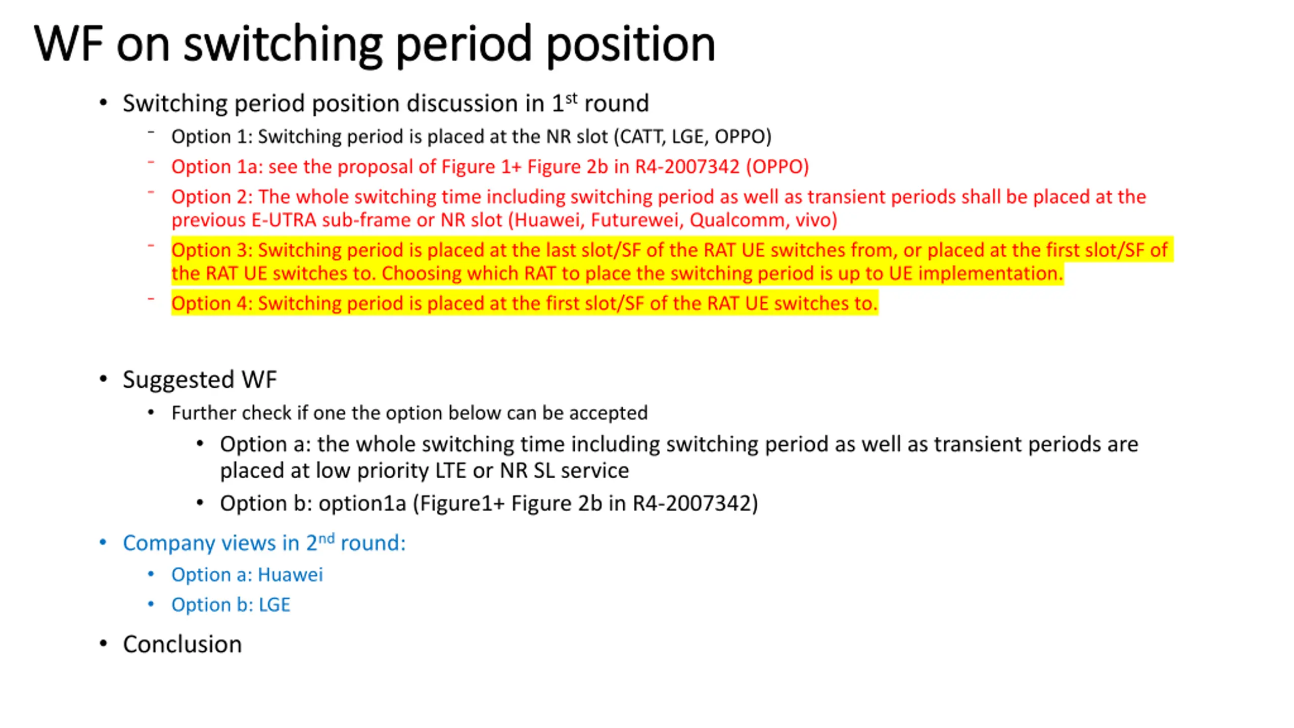 WF on switching period position WF on switching period position Switching period position discussion in 1stround Option 1: Switching period is placed at the NR slot (CATT, LGE, OPPO) Option 1a: see the proposal of Figure 1+ Figure 2b in R4-2007342 (OPPO) Option 2: The whole switching time including switching period as well as transient periods shall be placed at the previous E-UTRA sub-frame or NR slot (Huawei, Futurewei, Qualcomm, vivo) Option 3: Switching period is placed at the last slot/SF of the RAT UE switches from, or placed at the first slot/SF of the RAT UE switches to. Choosing which RAT to place the switching period is up to UE implementation. Option 4: Switching period is placed at the first slot/SF of the RAT UE switches to. Suggested WF Further check if one the option below can be accepted Option a: the whole switching time including switching period as well as transient periods are placed at low priority LTE or NR SL service Option b: option1a (Figure1+ Figure 2b in R4-2007342) Company views in 2ndround: Option a: Huawei Option b: LGE Conclusion