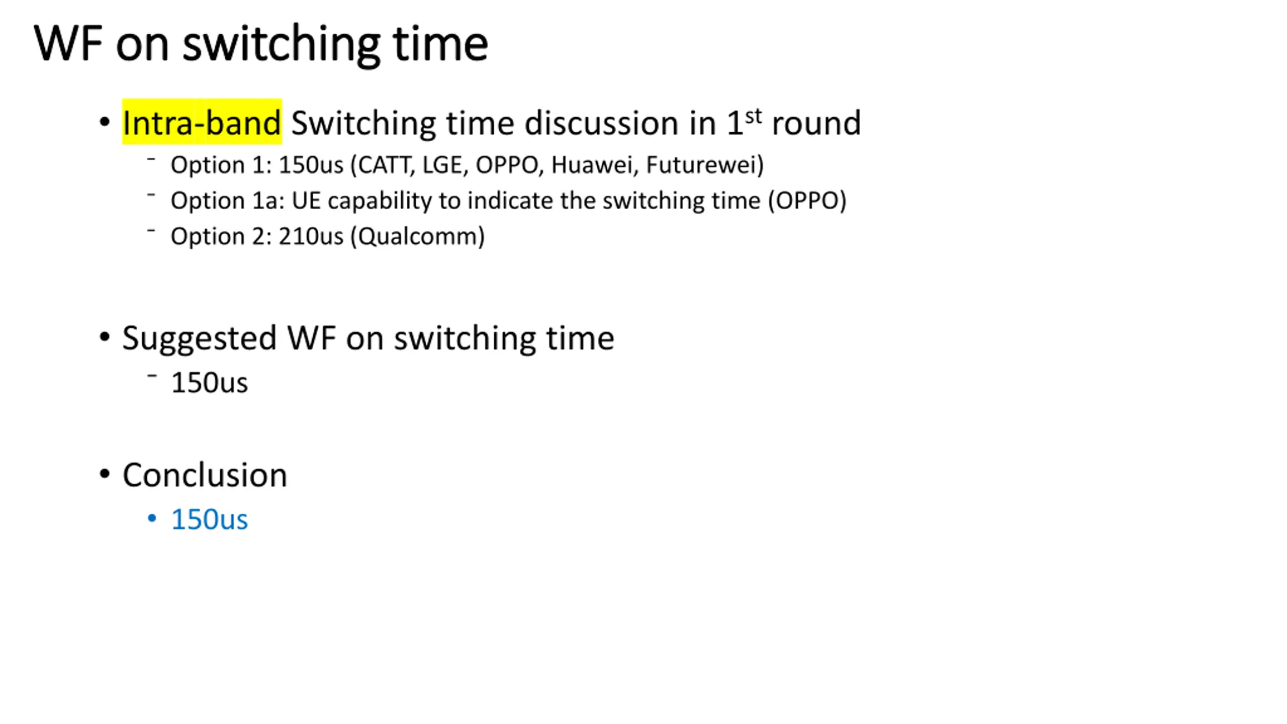 WF on switching time WF on switching time Intra-band Switching time discussion in 1stround Option 1: 150us (CATT, LGE, OPPO, Huawei, Futurewei) Option 1a: UE capability to indicate the switching time (OPPO) Option 2: 210us (Qualcomm) Suggested WF on switching time 150us Conclusion 150us