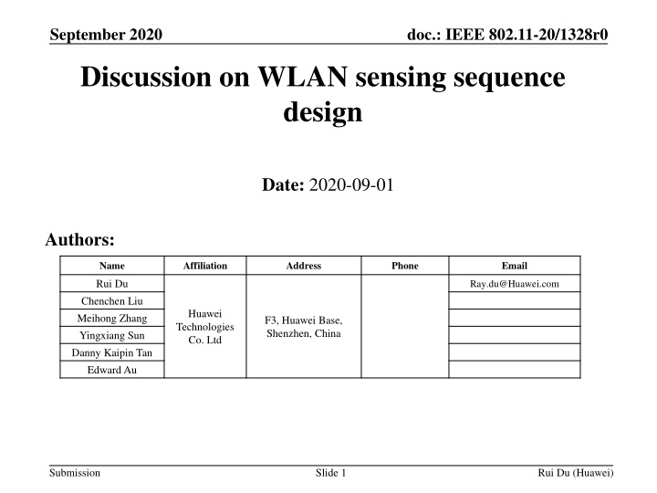 September 2020 doc.: IEEE 802.11-20/1328r0 Discussion on WLAN sensing sequence design Date: 2020-09-01 Authors: Name Affiliation Address Phone Email Rui Du Chenchen Liu Meihong Zhang Yingxiang Sun Danny Kaipin Tan Edward Au Ray.du@Huawei.com Huawei Technologies Co. Ltd F3, Huawei Base, Shenzhen, China Submission Slide 1 Rui Du (Huawei)
