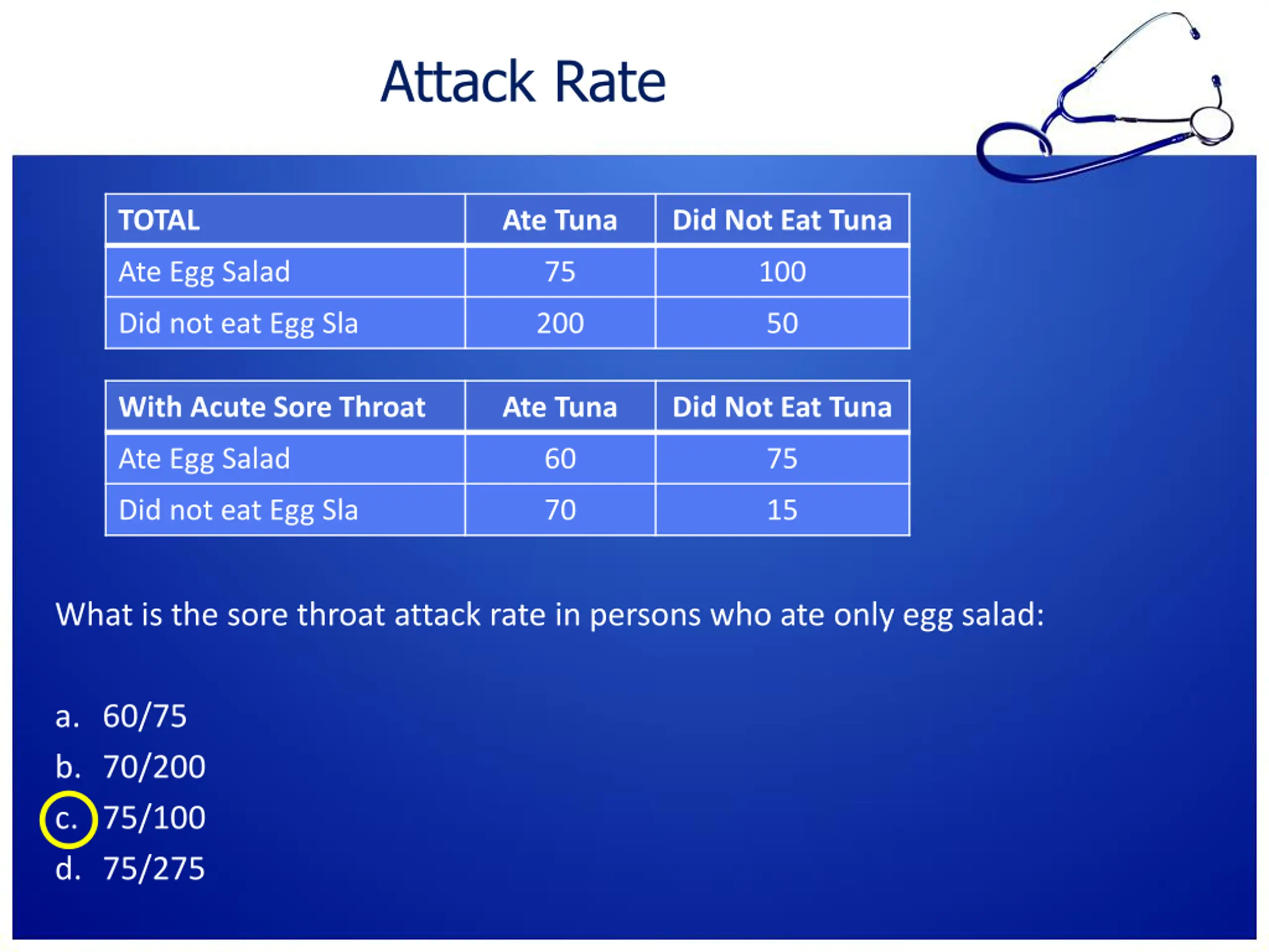 Attack Rate TOTAL Ate Tuna Did Not Eat Tuna Ate Egg Salad 75 100 Did not eat Egg Sla 200 50 With Acute Sore Throat Ate Tuna Did Not Eat Tuna Ate Egg Salad 60 75 Did not eat Egg Sla 70 15 What is the sore throat attack rate in persons who ate only egg salad: a. 60/75 b. 70/200 c. 75/100 d. 75/275