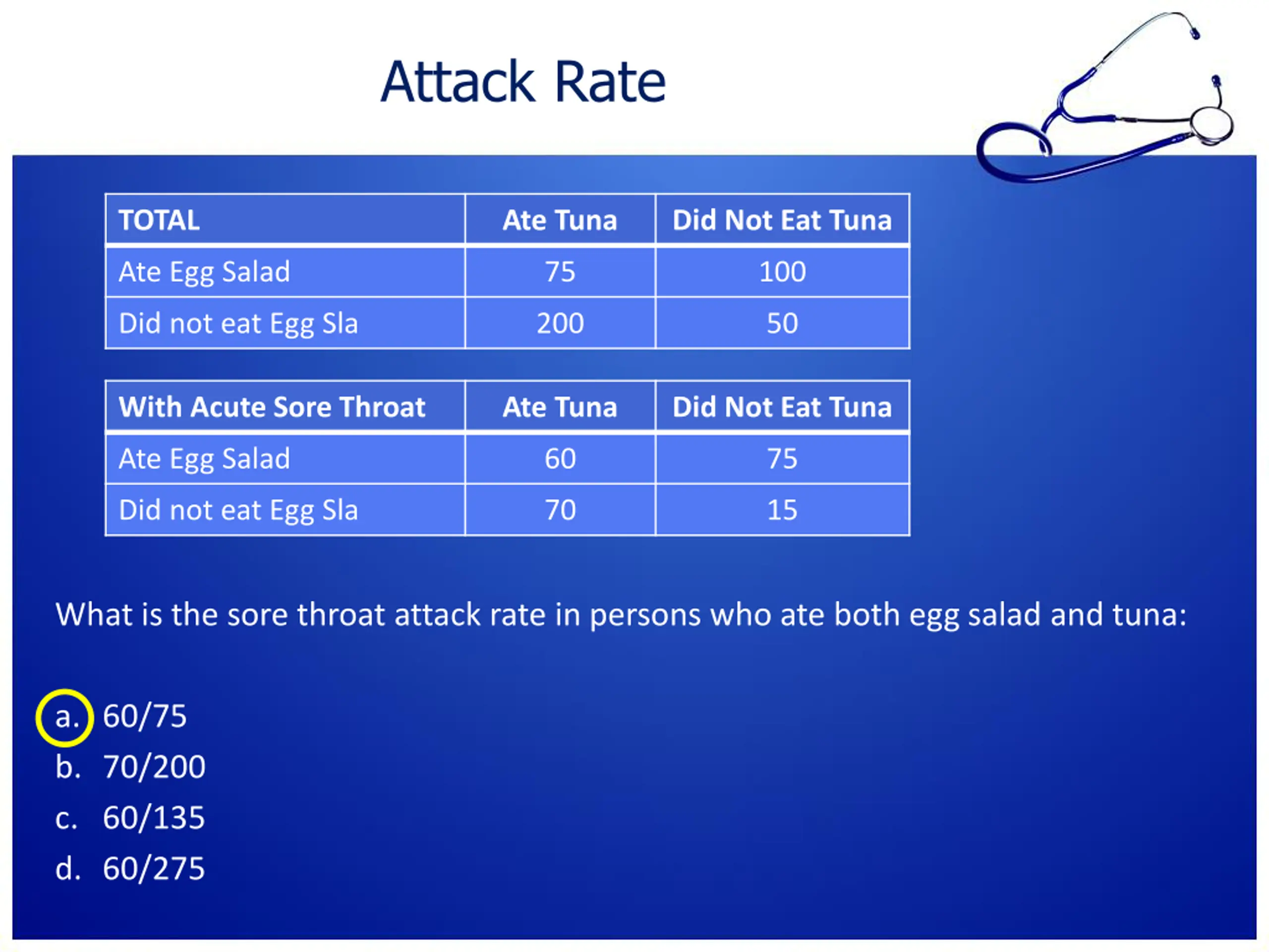 Attack Rate TOTAL Ate Tuna Did Not Eat Tuna Ate Egg Salad 75 100 Did not eat Egg Sla 200 50 With Acute Sore Throat Ate Tuna Did Not Eat Tuna Ate Egg Salad 60 75 Did not eat Egg Sla 70 15 What is the sore throat attack rate in persons who ate both egg salad and tuna: a. 60/75 b. 70/200 c. 60/135 d. 60/275
