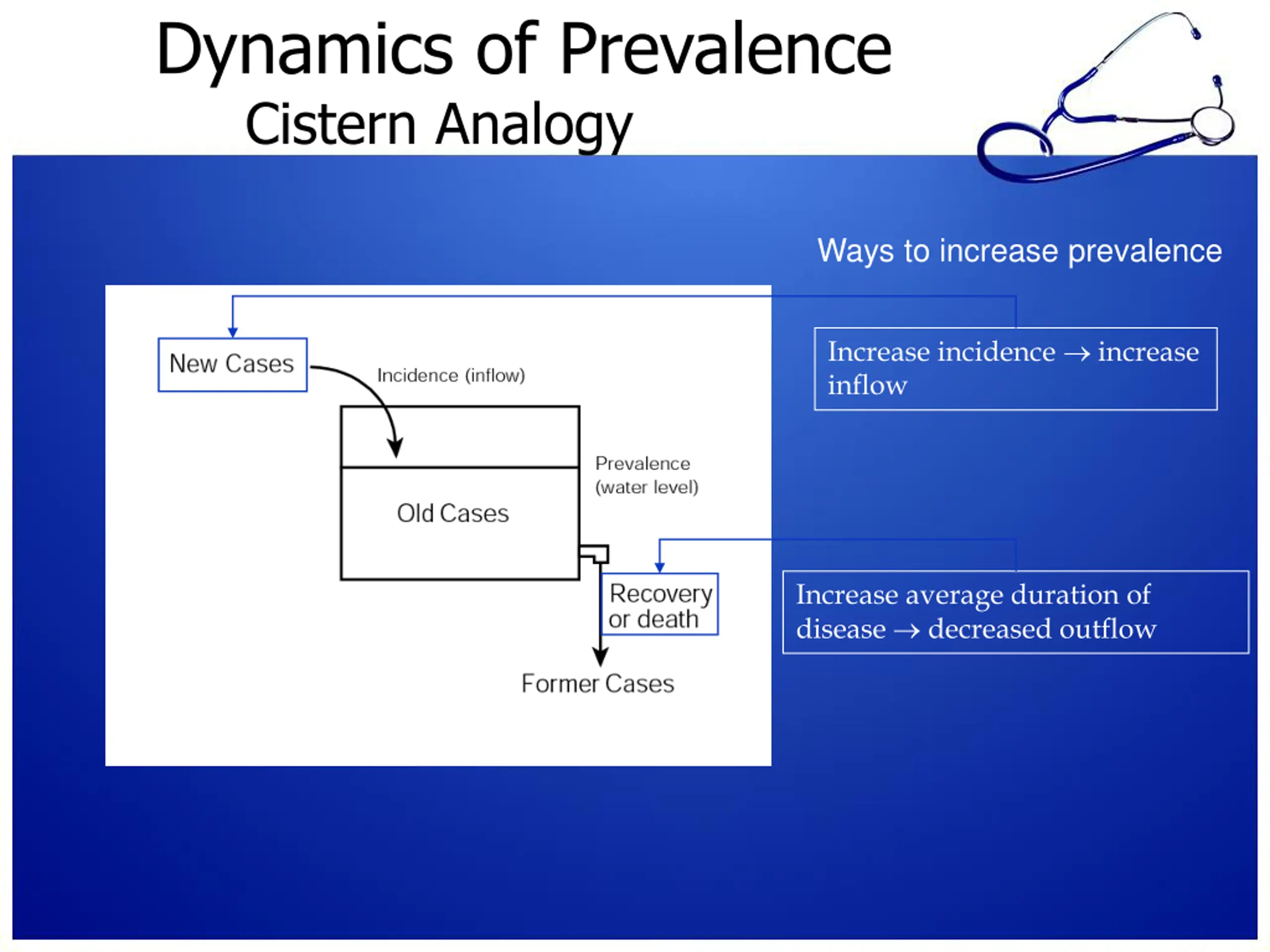 Dynamics of Prevalence Cistern Analogy (p. 185) Ways to increase prevalence Increase incidence increase inflow Increase average duration of disease decreased outflow