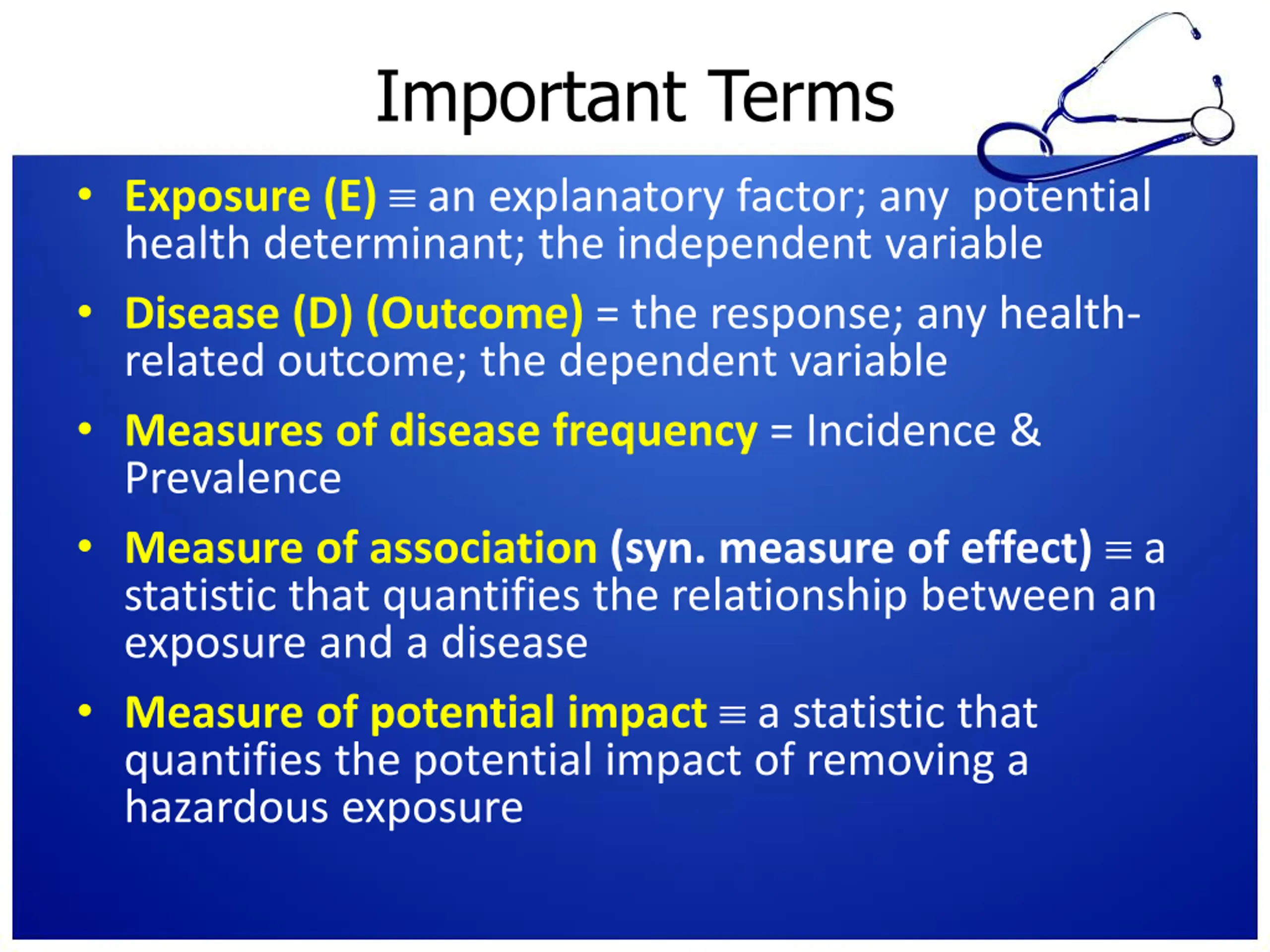 Important Terms Exposure (E) an explanatory factor; any potential health determinant; the independent variable Disease (D) (Outcome) = the response; any health- related outcome; the dependent variable Measures of disease frequency = Incidence & Prevalence Measure of association (syn. measure of effect) a statistic that quantifies the relationship between an exposure and a disease Measure of potential impact a statistic that quantifies the potential impact of removing a hazardous exposure