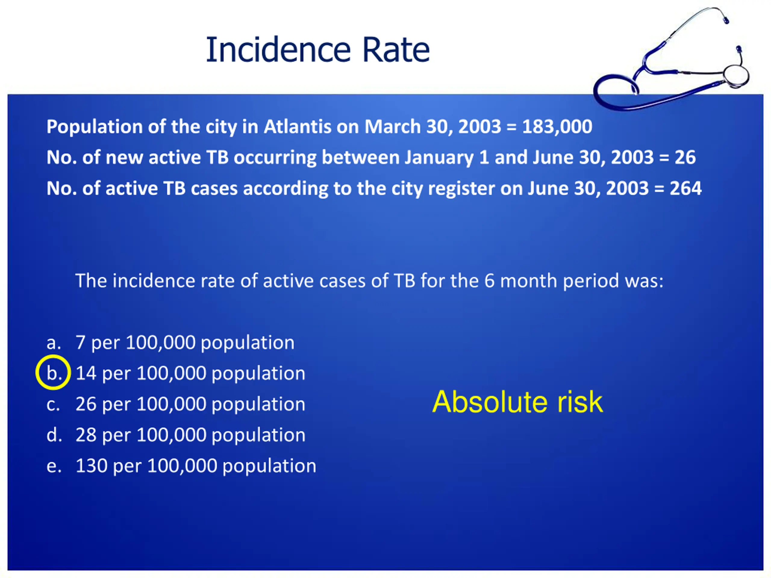 Incidence Rate Population of the city in Atlantis on March 30, 2003 = 183,000 No. of new active TB occurring between January 1 and June 30, 2003 = 26 No. of active TB cases according to the city register on June 30, 2003 = 264 The incidence rate of active cases of TB for the 6 month period was: a. 7 per 100,000 population b. 14 per 100,000 population c. 26 per 100,000 population d. 28 per 100,000 population e. 130 per 100,000 population Absolute risk
