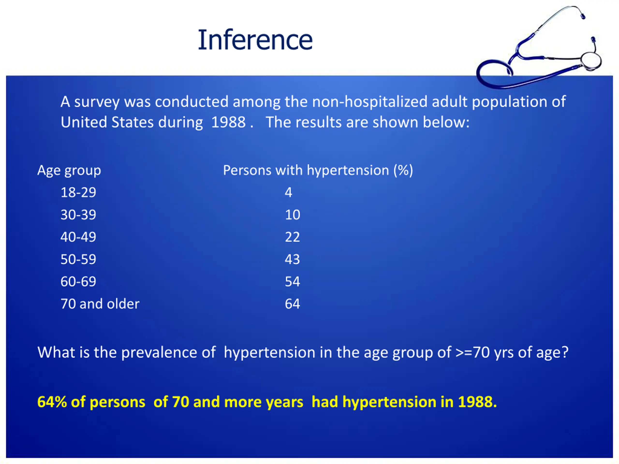 Inference A survey was conducted among the non-hospitalized adult population of United States during 1988 . The results are shown below: Age group 18-29 30-39 40-49 50-59 60-69 70 and older Persons with hypertension (%) 4 10 22 43 54 64 What is the prevalence of hypertension in the age group of >=70 yrs of age? 64% of persons of 70 and more years had hypertension in 1988.
