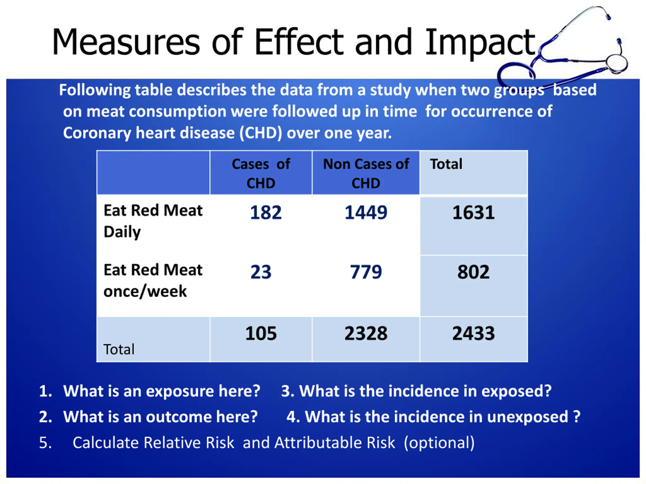 Measures of Effect and Impact Following table describes the data from a study when two groups based on meat consumption were followed up in time for occurrence of Coronary heart disease (CHD) over one year. Cases of CHD 182 Non Cases of CHD 1449 Total Eat Red Meat Daily 1631 Eat Red Meat once/week 23 779 802 105 2328 2433 Total 1. What is an exposure here? 3. What is the incidence in exposed? 2. What is an outcome here? 4. What is the incidence in unexposed ? 5. Calculate Relative Risk and Attributable Risk (optional)