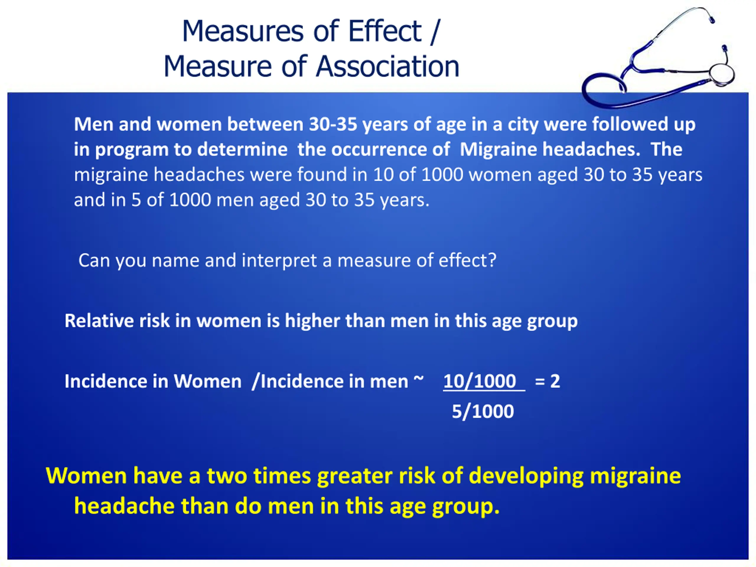 Measures of Effect / Measure of Association Men and women between 30-35 years of age in a city were followed up in program to determine the occurrence of Migraine headaches. The migraine headaches were found in 10 of 1000 women aged 30 to 35 years and in 5 of 1000 men aged 30 to 35 years. Can you name and interpret a measure of effect? Relative risk in women is higher than men in this age group Incidence in Women /Incidence in men ~ 10/1000 = 2 5/1000 Women have a two times greater risk of developing migraine headache than do men in this age group.