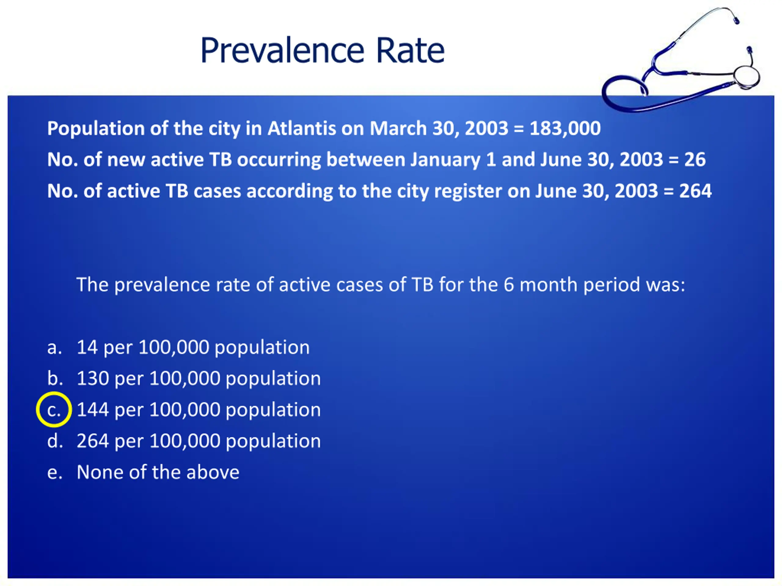 Prevalence Rate Population of the city in Atlantis on March 30, 2003 = 183,000 No. of new active TB occurring between January 1 and June 30, 2003 = 26 No. of active TB cases according to the city register on June 30, 2003 = 264 The prevalence rate of active cases of TB for the 6 month period was: a. 14 per 100,000 population b. 130 per 100,000 population c. 144 per 100,000 population d. 264 per 100,000 population e. None of the above