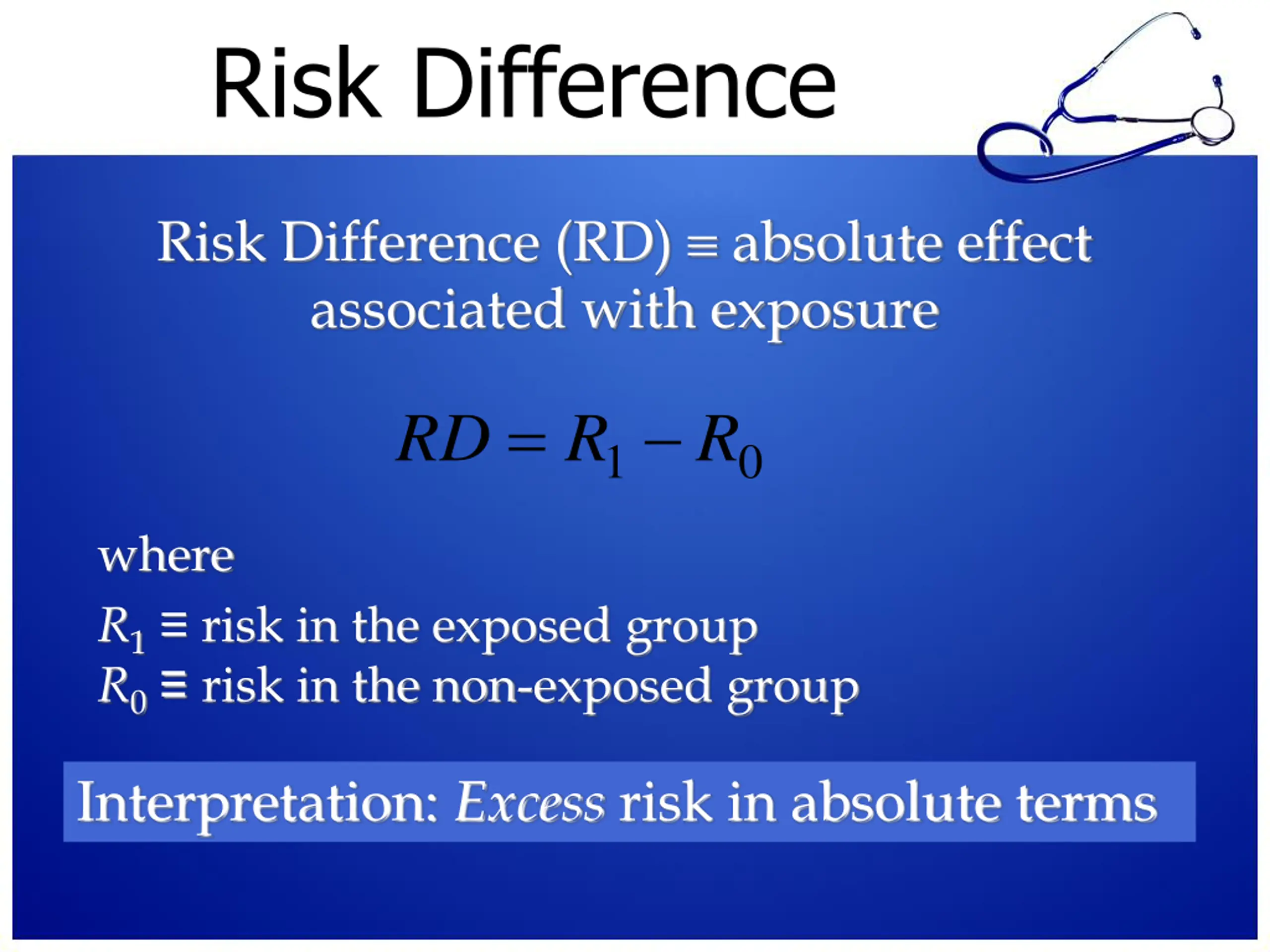 Risk Difference Risk Difference (RD) absolute effect associated with exposure = RD R R 1 0 where R1 risk in the exposed group R0 risk in the non-exposed group Interpretation: Excess risk in absolute terms