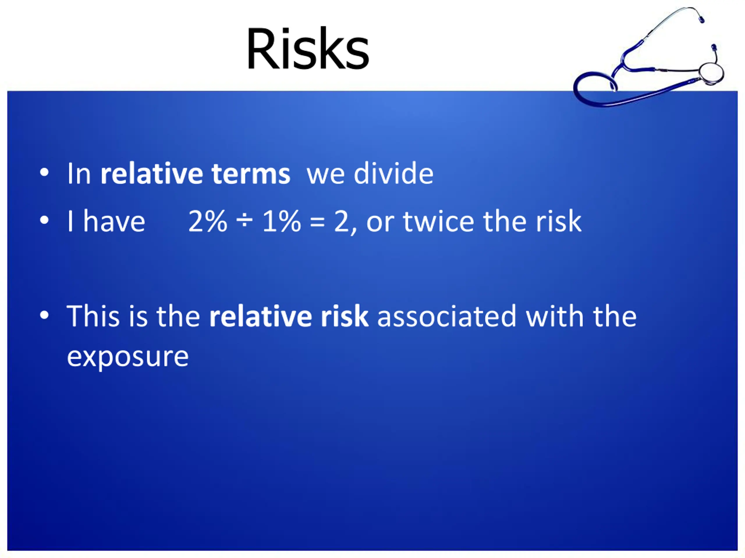 Risks In relative terms we divide I have 2% 1% = 2, or twice the risk This is the relative risk associated with the exposure