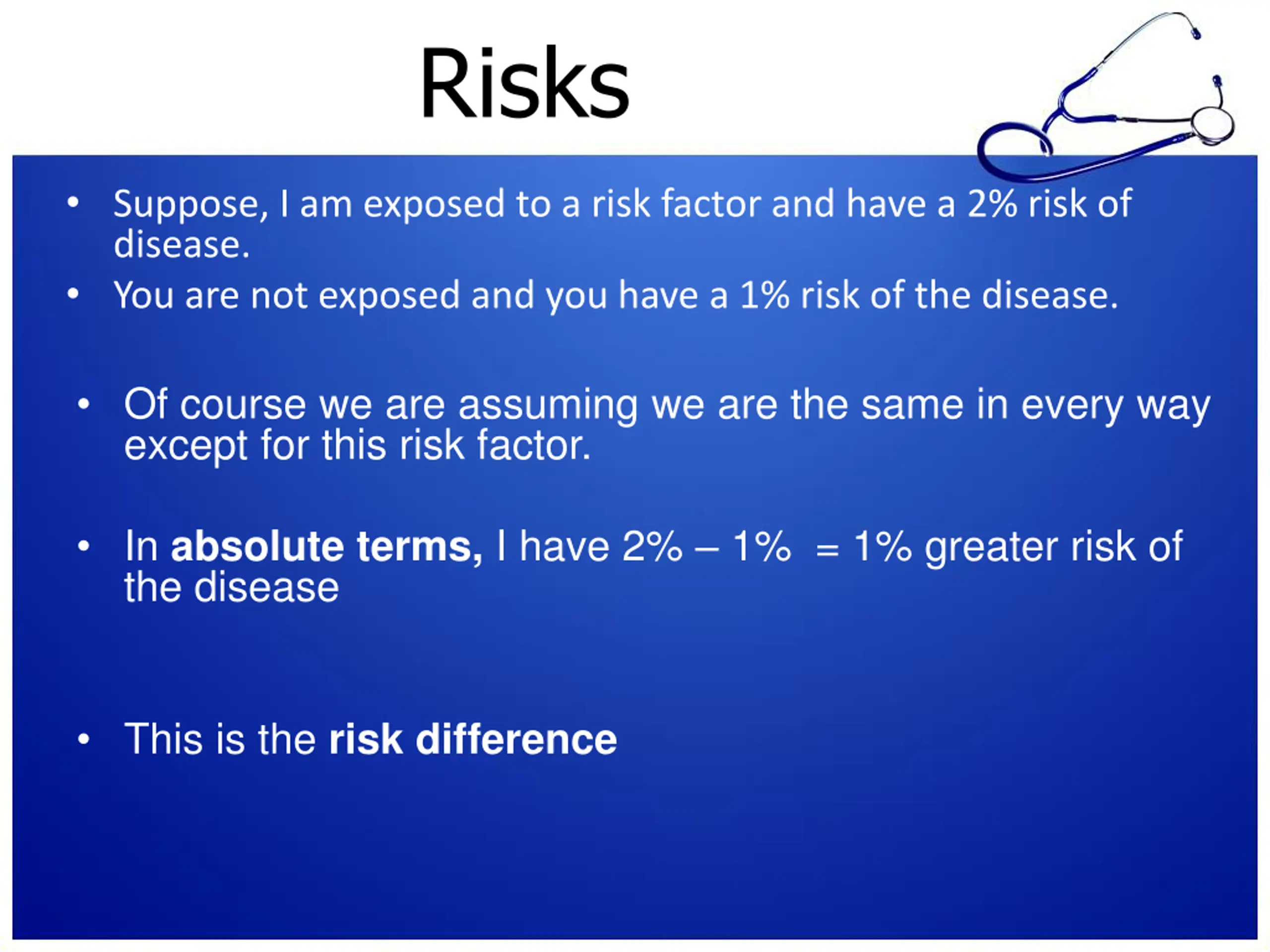 Risks Suppose, I am exposed to a risk factor and have a 2% risk of disease. You are not exposed and you have a 1% risk of the disease. Of course we are assuming we are the same in every way except for this risk factor. In absolute terms, I have 2% 1% = 1% greater risk of the disease This is the risk difference