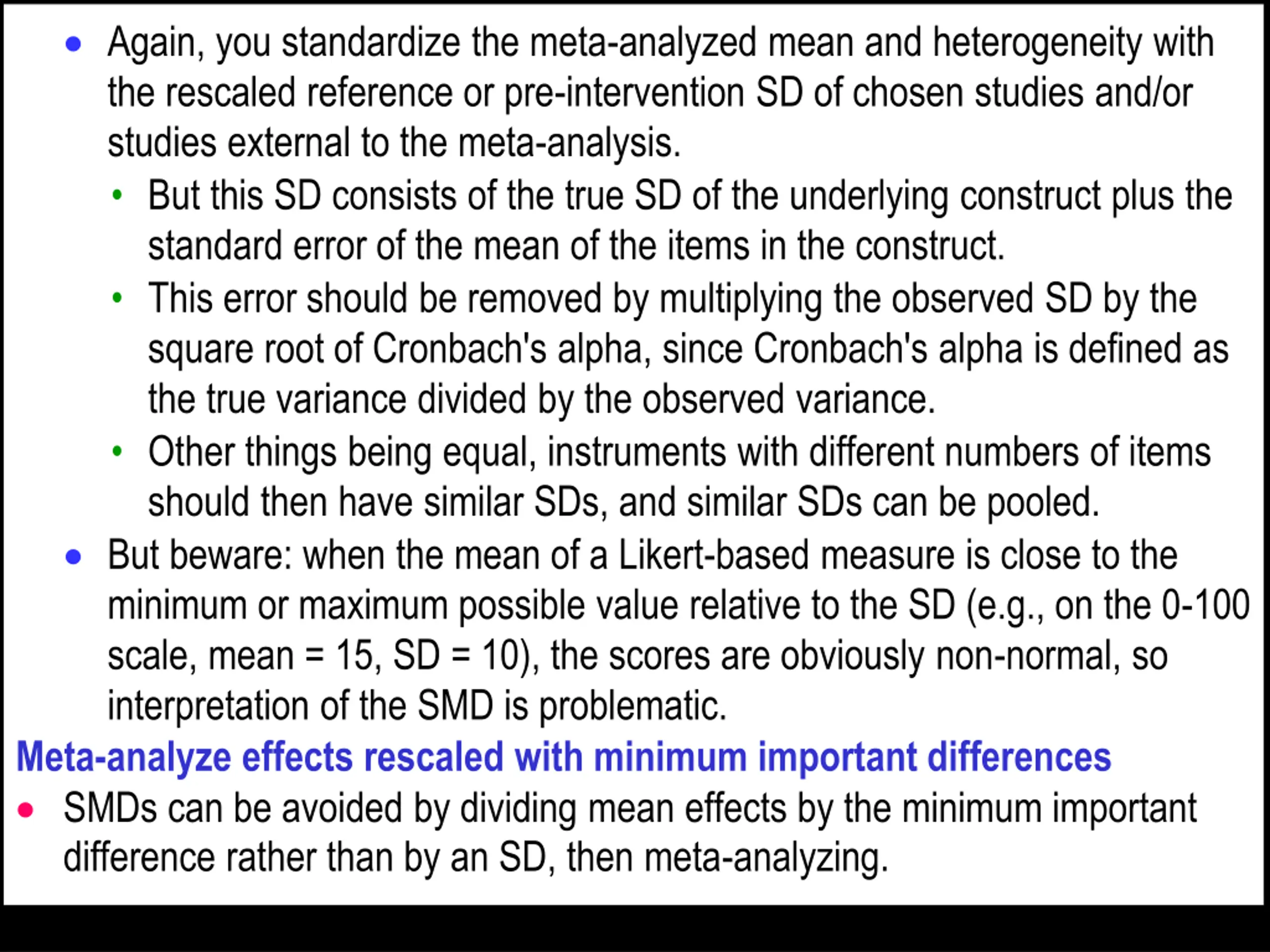 Again, you standardize the meta-analyzed mean and heterogeneity with the rescaled reference or pre-intervention SD of chosen studies and/or studies external to the meta-analysis. But this SD consists of the true SD of the underlying construct plus the standard error of the mean of the items in the construct. This error should be removed by multiplying the observed SD by the square root of Cronbach's alpha, since Cronbach's alpha is defined as the true variance divided by the observed variance. Other things being equal, instruments with different numbers of items should then have similar SDs, and similar SDs can be pooled. But beware: when the mean of a Likert-based measure is close to the minimum or maximum possible value relative to the SD (e.g., on the 0-100 scale, mean = 15, SD = 10), the scores are obviously non-normal, so interpretation of the SMD is problematic. Meta-analyze effects rescaled with minimum important differences SMDs can be avoided by dividing mean effects by the minimum important difference rather than by an SD, then meta-analyzing.