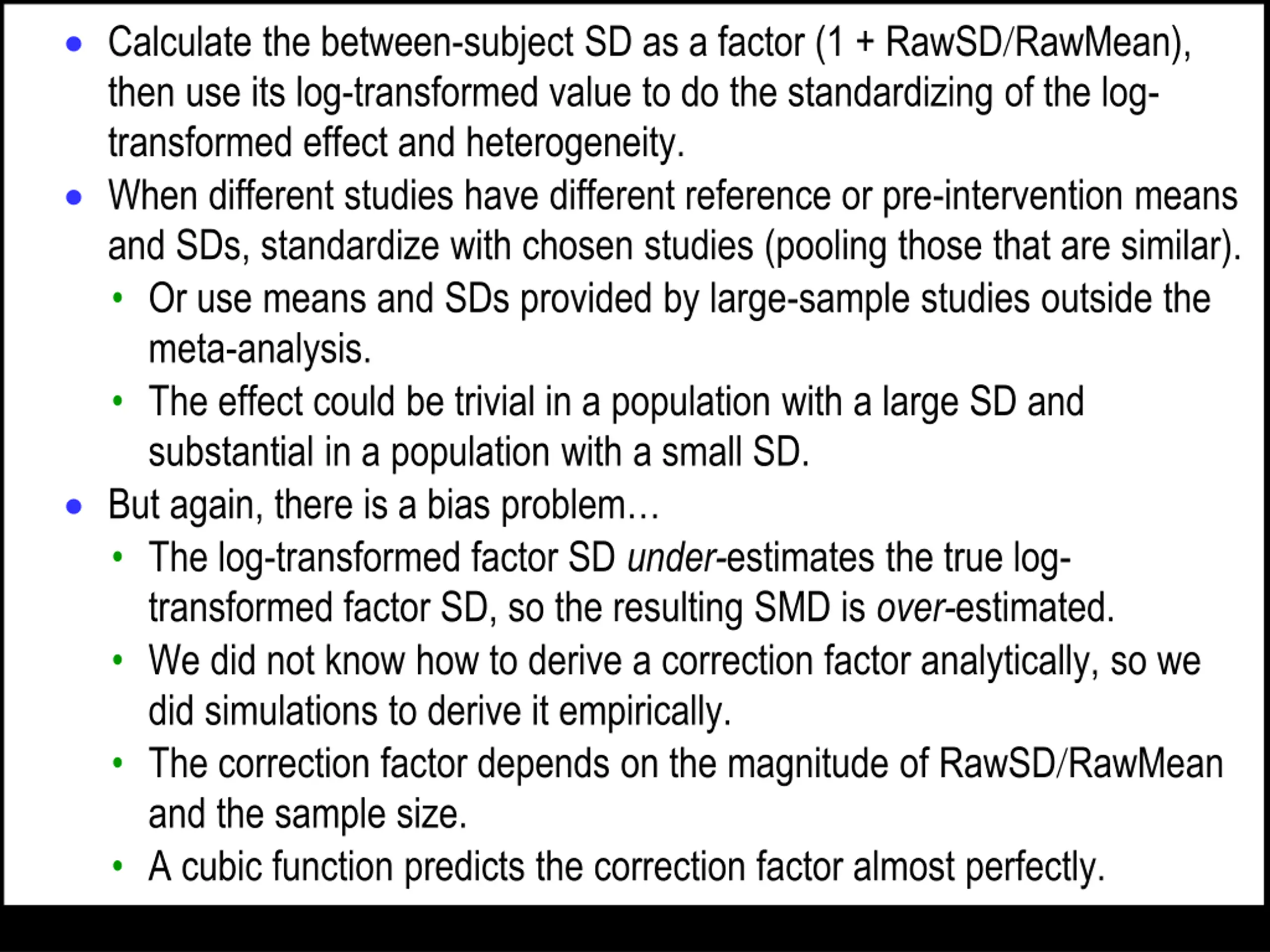 Calculate the between-subject SD as a factor (1 + RawSDRawMean), then use its log-transformed value to do the standardizing of the log- transformed effect and heterogeneity. When different studies have different reference or pre-intervention means and SDs, standardize with chosen studies (pooling those that are similar). Or use means and SDs provided by large-sample studies outside the meta-analysis. The effect could be trivial in a population with a large SD and substantial in a population with a small SD. But again, there is a bias problem The log-transformed factor SD under-estimates the true log- transformed factor SD, so the resulting SMD is over-estimated. We did not know how to derive a correction factor analytically, so we did simulations to derive it empirically. The correction factor depends on the magnitude of RawSD RawMean and the sample size. A cubic function predicts the correction factor almost perfectly.