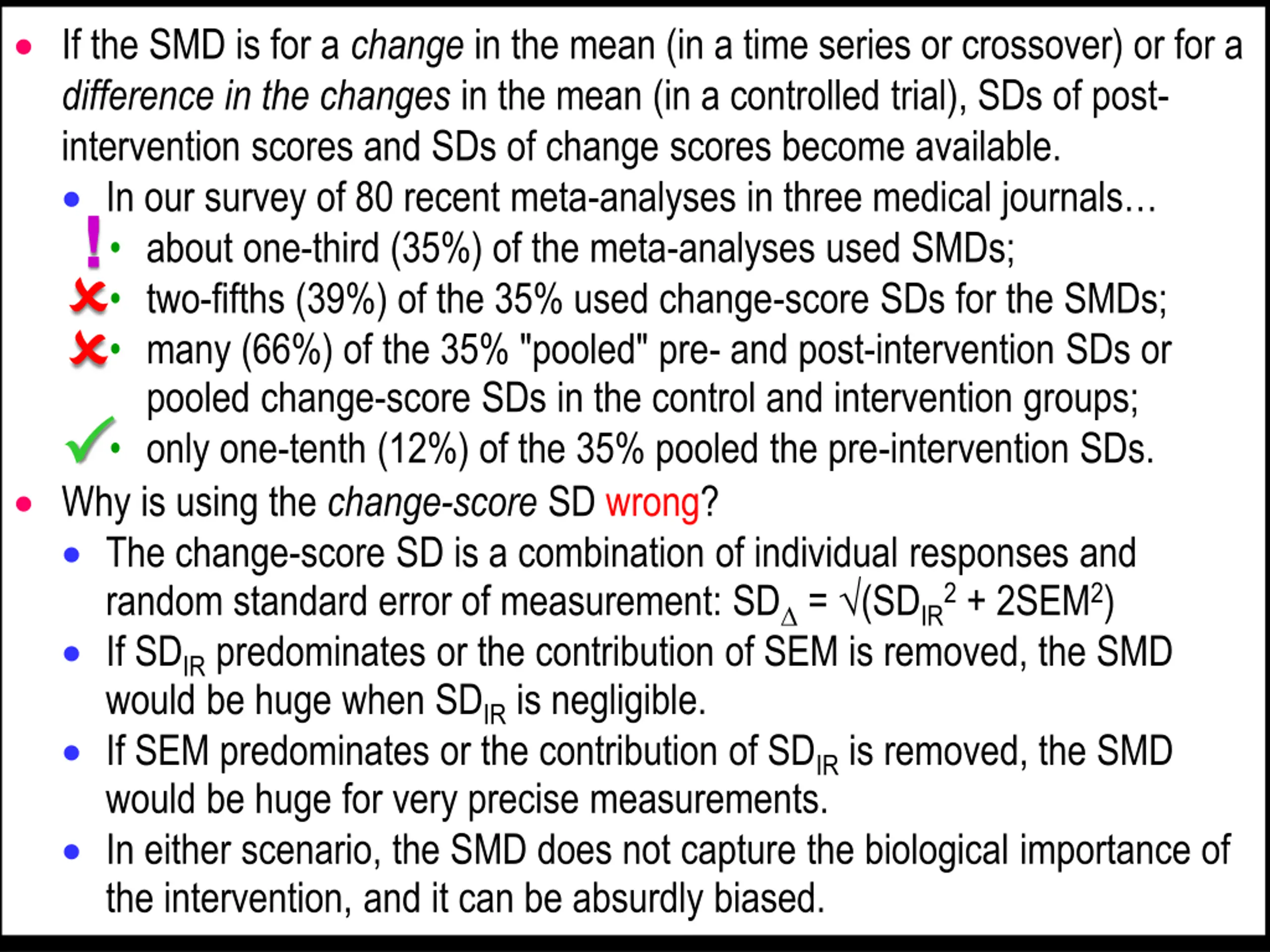 If the SMD is for a change in the mean (in a time series or crossover) or for a difference in the changes in the mean (in a controlled trial), SDs of post- intervention scores and SDs of change scores become available. In our survey of 80 recent meta-analyses in three medical journals about one-third (35%) of the meta-analyses used SMDs; two-fifths (39%) of the 35% used change-score SDs for the SMDs; many (66%) of the 35% "pooled" pre- and post-intervention SDs or pooled change-score SDs in the control and intervention groups; only one-tenth (12%) of the 35% pooled the pre-intervention SDs. Why is using the change-score SD wrong? The change-score SD is a combination of individual responses and random standard error of measurement: SD = (SDIR2 + 2SEM2) If SDIR predominates or the contribution of SEM is removed, the SMD would be huge when SDIR is negligible. If SEM predominates or the contribution of SDIR is removed, the SMD would be huge for very precise measurements. In either scenario, the SMD does not capture the biological importance of the intervention, and it can be absurdly biased. !
