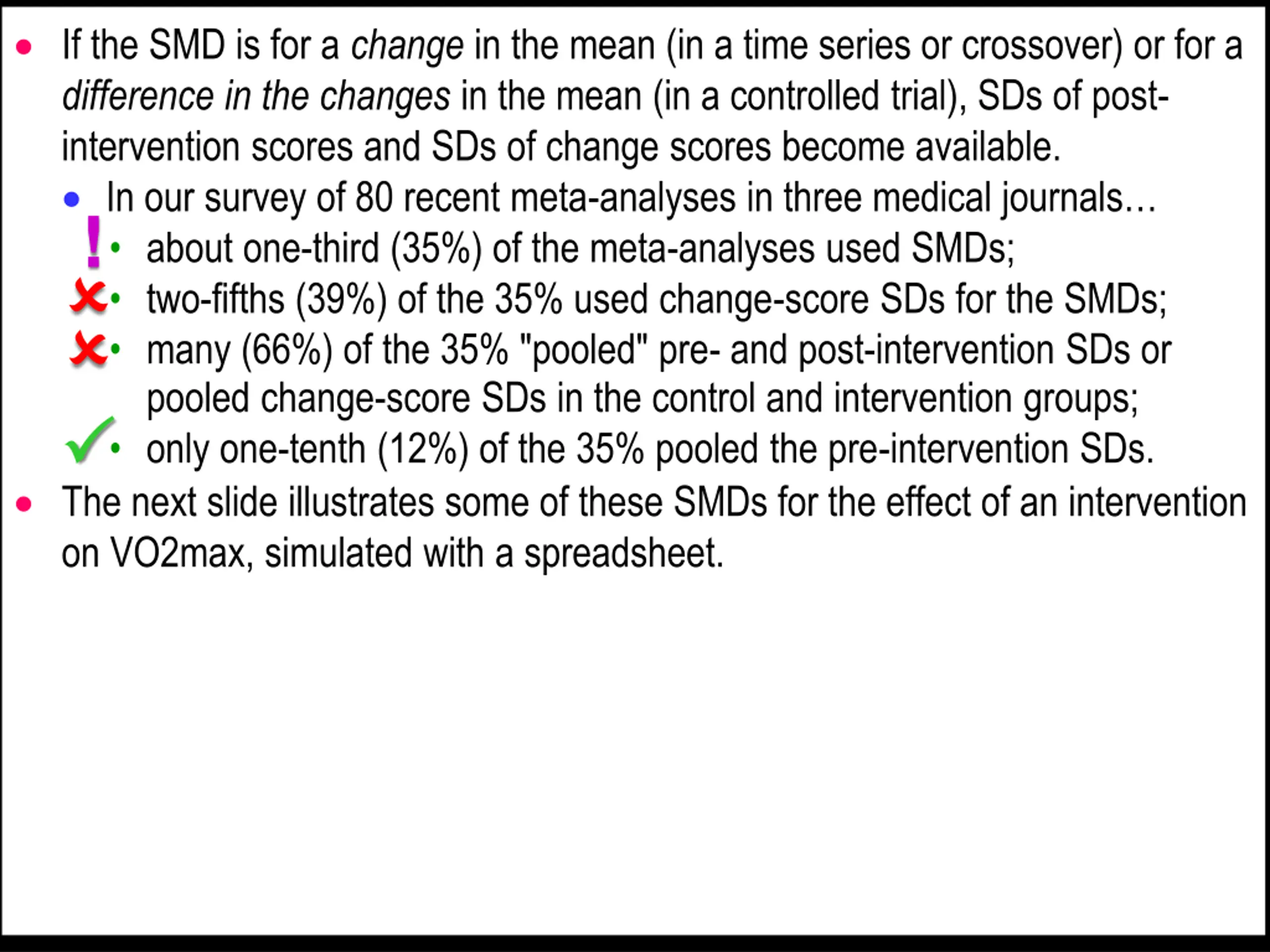 If the SMD is for a change in the mean (in a time series or crossover) or for a difference in the changes in the mean (in a controlled trial), SDs of post- intervention scores and SDs of change scores become available. In our survey of 80 recent meta-analyses in three medical journals about one-third (35%) of the meta-analyses used SMDs; two-fifths (39%) of the 35% used change-score SDs for the SMDs; many (66%) of the 35% "pooled" pre- and post-intervention SDs or pooled change-score SDs in the control and intervention groups; only one-tenth (12%) of the 35% pooled the pre-intervention SDs. The next slide illustrates some of these SMDs for the effect of an intervention on VO2max, simulated with a spreadsheet. !