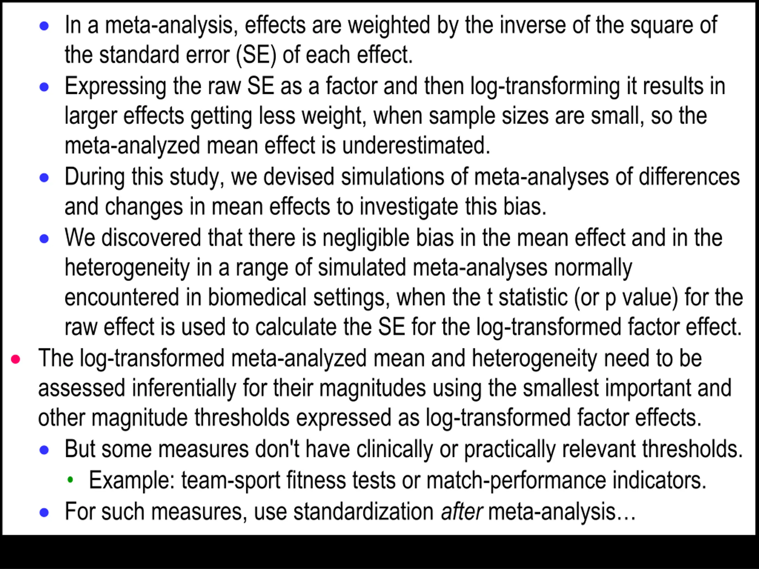In a meta-analysis, effects are weighted by the inverse of the square of the standard error (SE) of each effect. Expressing the raw SE as a factor and then log-transforming it results in larger effects getting less weight, when sample sizes are small, so the meta-analyzed mean effect is underestimated. During this study, we devised simulations of meta-analyses of differences and changes in mean effects to investigate this bias. We discovered that there is negligible bias in the mean effect and in the heterogeneity in a range of simulated meta-analyses normally encountered in biomedical settings, when the t statistic (or p value) for the raw effect is used to calculate the SE for the log-transformed factor effect. The log-transformed meta-analyzed mean and heterogeneity need to be assessed inferentially for their magnitudes using the smallest important and other magnitude thresholds expressed as log-transformed factor effects. But some measures don't have clinically or practically relevant thresholds. Example: team-sport fitness tests or match-performance indicators. For such measures, use standardization after meta-analysis