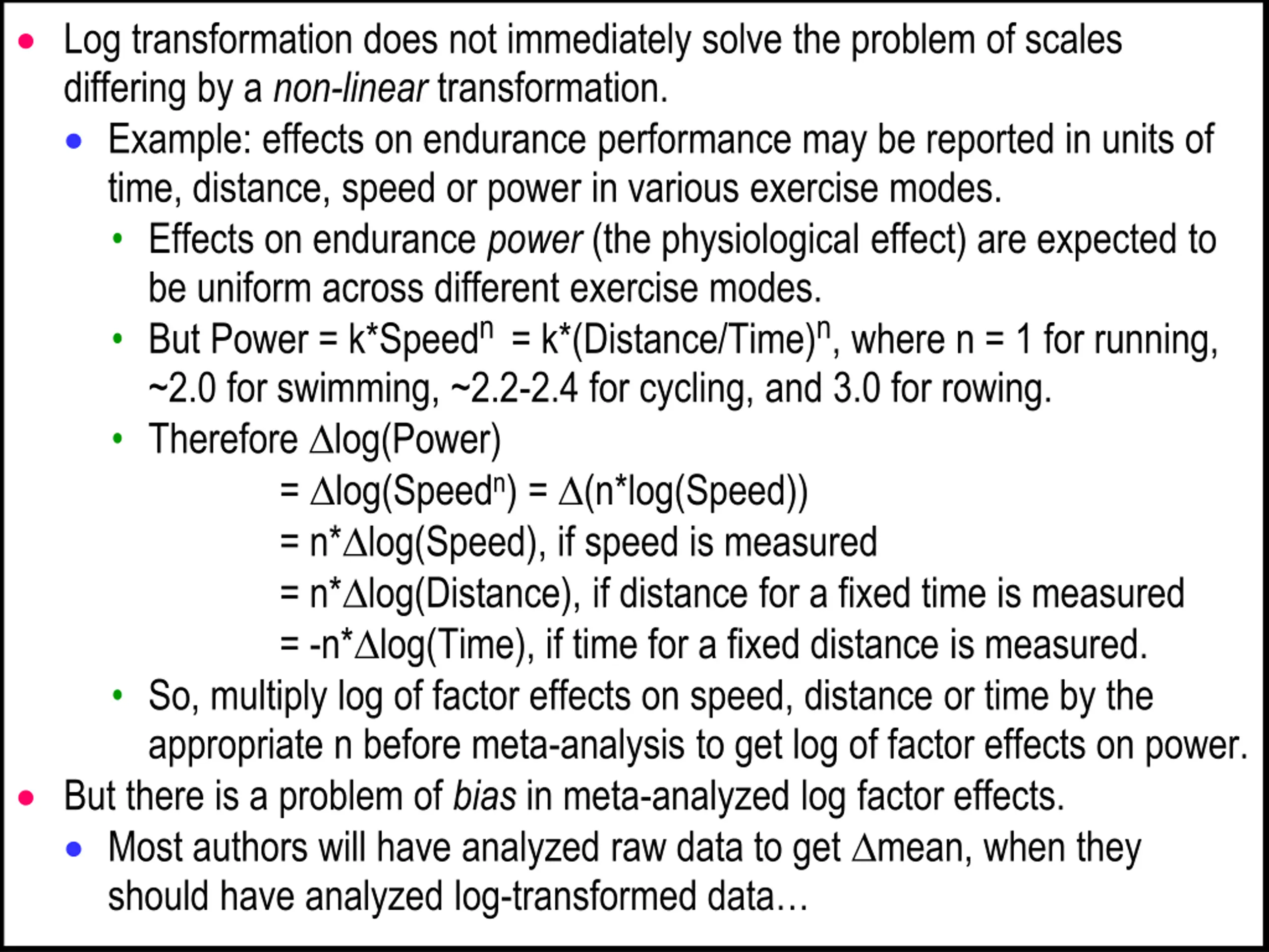 Log transformation does not immediately solve the problem of scales differing by a non-linear transformation. Example: effects on endurance performance may be reported in units of time, distance, speed or power in various exercise modes. Effects on endurance power (the physiological effect) are expected to be uniform across different exercise modes. But Power = k*Speedn= k*(Distance/Time)n, where n = 1 for running, ~2.0 for swimming, ~2.2-2.4 for cycling, and 3.0 for rowing. Therefore log(Power) = log(Speedn) = (n*log(Speed)) = n* log(Speed), if speed is measured = n* log(Distance), if distance for a fixed time is measured = -n* log(Time), if time for a fixed distance is measured. So, multiply log of factor effects on speed, distance or time by the appropriate n before meta-analysis to get log of factor effects on power. But there is a problem of bias in meta-analyzed log factor effects. Most authors will have analyzed raw data to get mean, when they should have analyzed log-transformed data