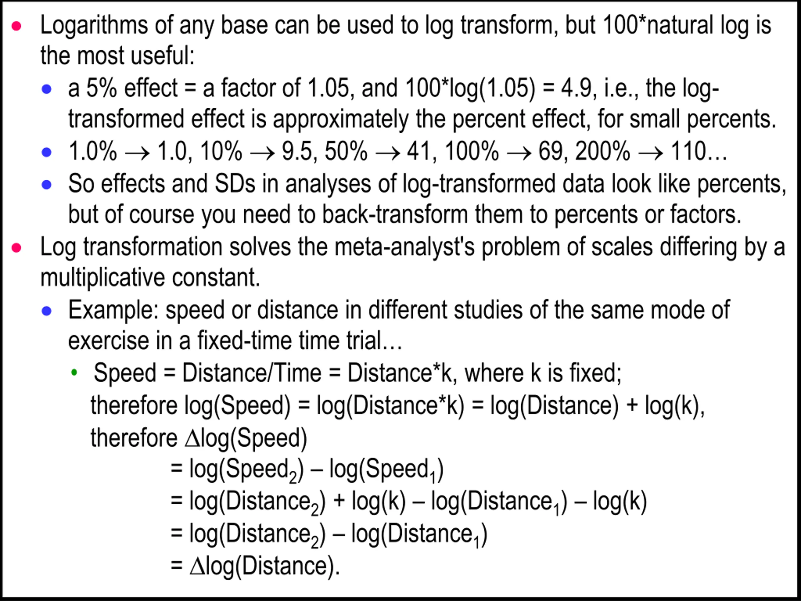 Logarithms of any base can be used to log transform, but 100*natural log is the most useful: a 5% effect = a factor of 1.05, and 100*log(1.05) = 4.9, i.e., the log- transformed effect is approximately the percent effect, for small percents. 1.0% 1.0, 10% 9.5, 50% 41, 100% 69, 200% 110 So effects and SDs in analyses of log-transformed data look like percents, but of course you need to back-transform them to percents or factors. Log transformation solves the meta-analyst's problem of scales differing by a multiplicative constant. Example: speed or distance in different studies of the same mode of exercise in a fixed-time time trial Speed = Distance/Time = Distance*k, where k is fixed; therefore log(Speed) = log(Distance*k) = log(Distance) + log(k), therefore log(Speed) = log(Speed2) log(Speed1) = log(Distance2) + log(k) log(Distance1) log(k) = log(Distance2) log(Distance1) = log(Distance).