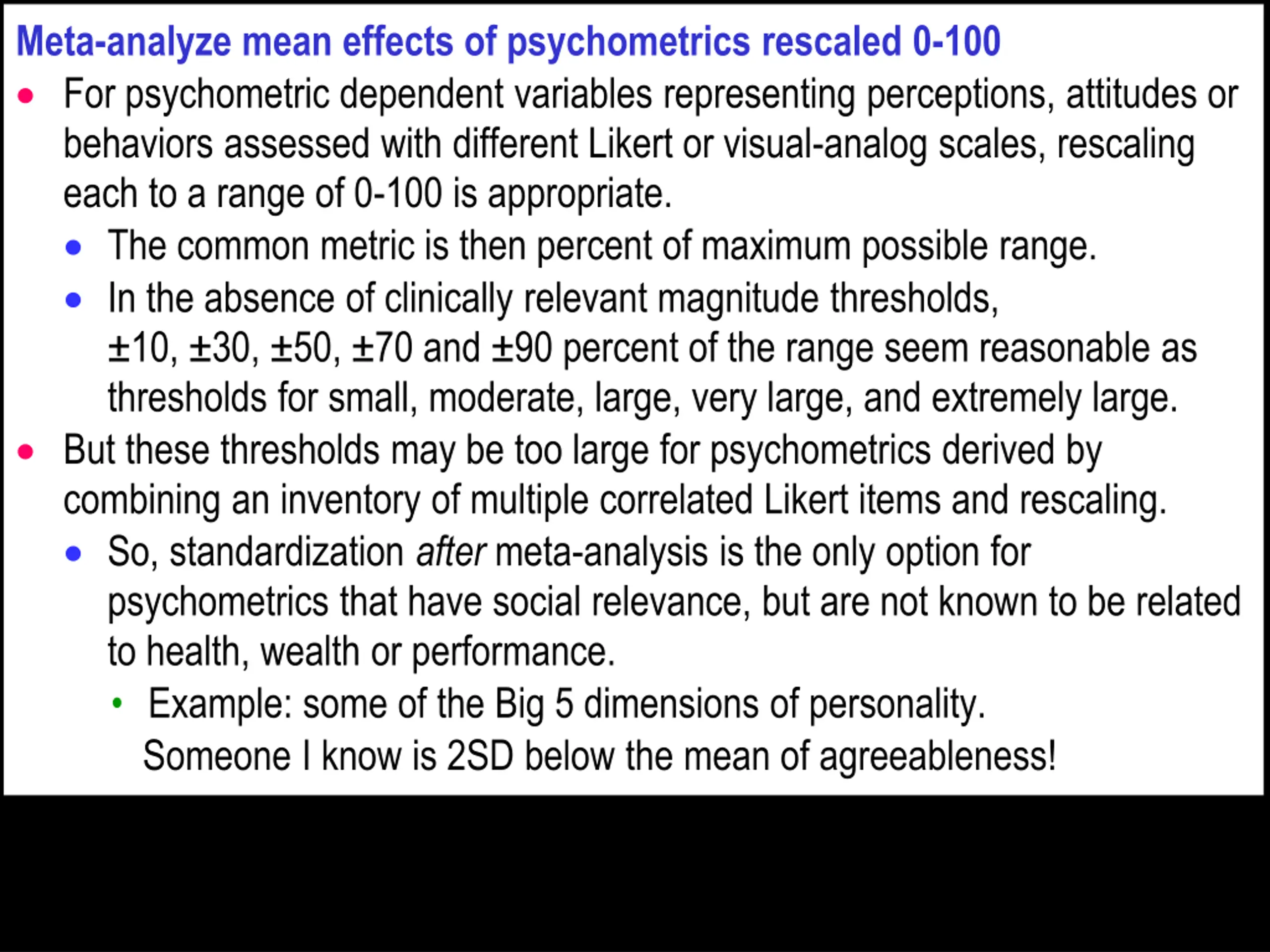 Meta-analyze mean effects of psychometrics rescaled 0-100 For psychometric dependent variables representing perceptions, attitudes or behaviors assessed with different Likert or visual-analog scales, rescaling each to a range of 0-100 is appropriate. The common metric is then percent of maximum possible range. In the absence of clinically relevant magnitude thresholds, 10, 30, 50, 70 and 90 percent of the range seem reasonable as thresholds for small, moderate, large, very large, and extremely large. But these thresholds may be too large for psychometrics derived by combining an inventory of multiple correlated Likert items and rescaling. So, standardization after meta-analysis is the only option for psychometrics that have social relevance, but are not known to be related to health, wealth or performance. Example: some of the Big 5 dimensions of personality. Someone I know is 2SD below the mean of agreeableness!