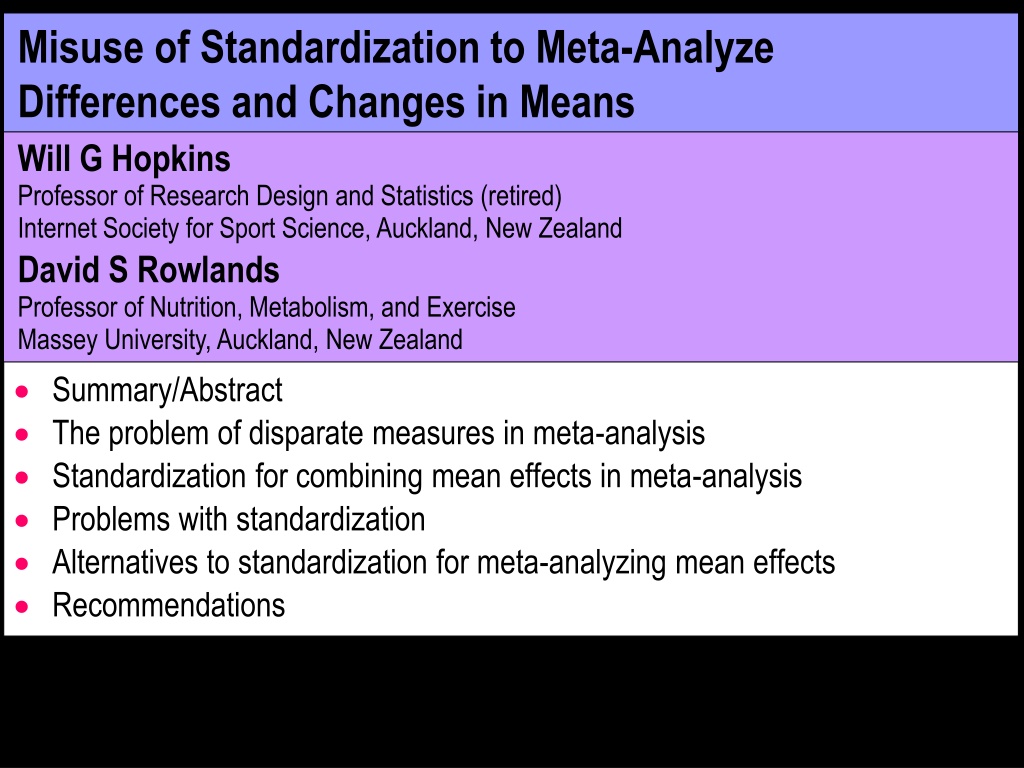 Misuse of Standardization to Meta-Analyze Differences and Changes in Means Will G Hopkins Professor of Research Design and Statistics (retired) Internet Society for Sport Science, Auckland, New Zealand David S Rowlands Professor of Nutrition, Metabolism, and Exercise Massey University, Auckland, New Zealand Summary/Abstract The problem of disparate measures in meta-analysis Standardization for combining mean effects in meta-analysis Problems with standardization Alternatives to standardization for meta-analyzing mean effects Recommendations